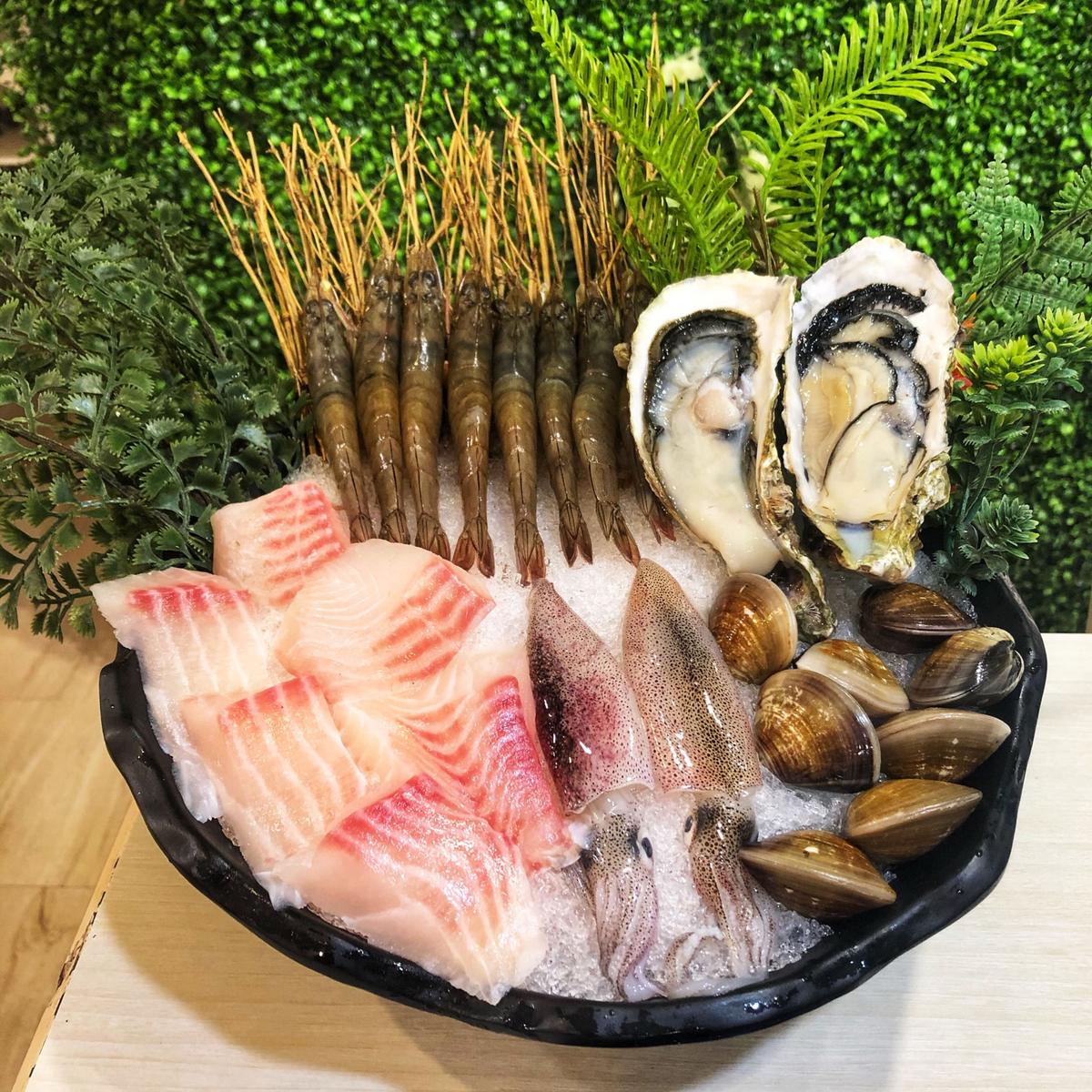 (精彩海鮮分享盤) 鮮蝦、蛤蜊、鯛魚片、生蠔x1