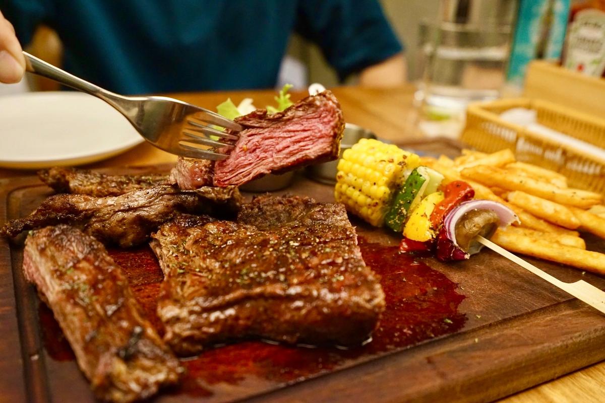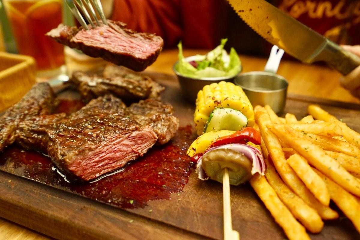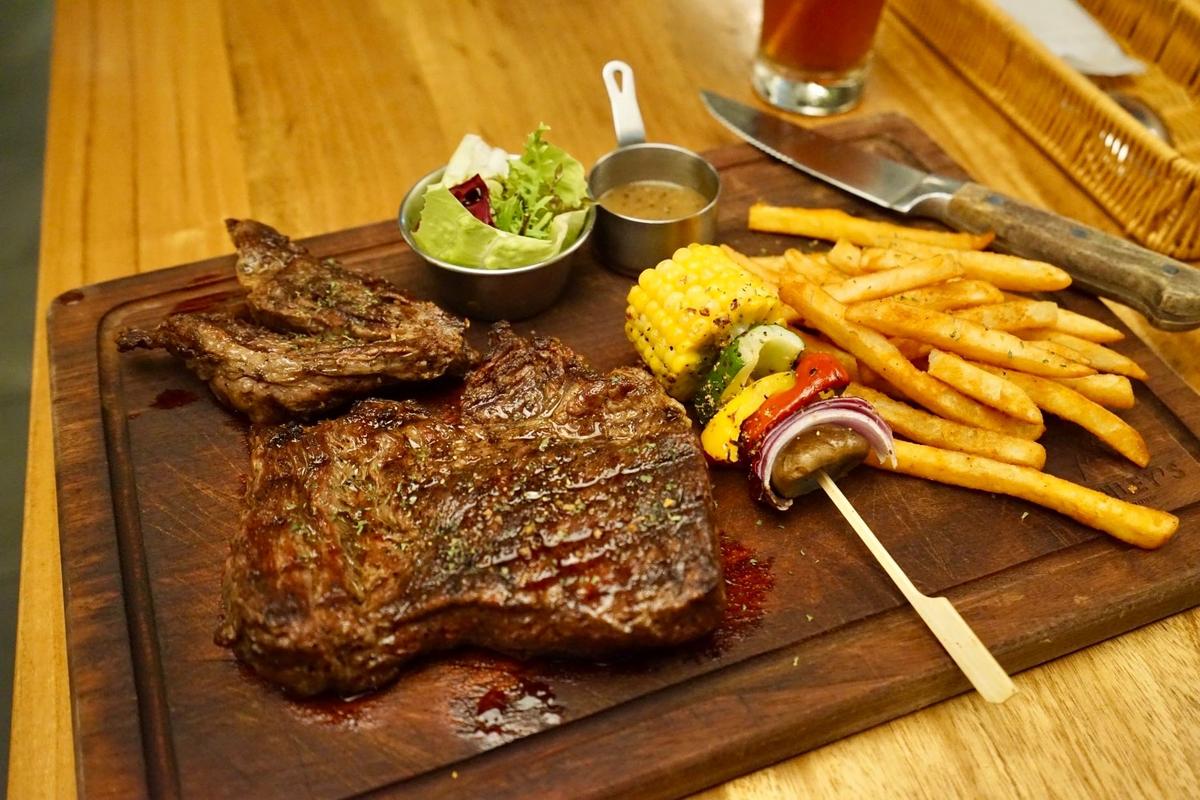 可以選擇兩種配菜,我們選了 #炭烤蔬菜串 #香酥薯條 兩個人吃這個主餐就很飽了,牛排碳香味沒有特別重,肉質因為是莎朗的關係比較有嚼勁,但還是蠻好吃的