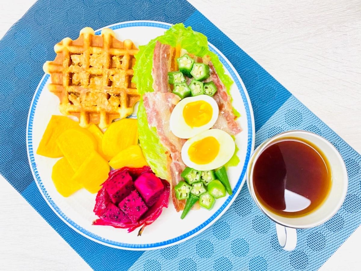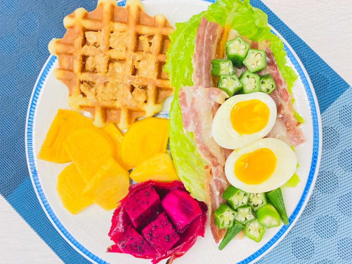 主食:培根水煮蛋生菜花生🥜醬鬆餅