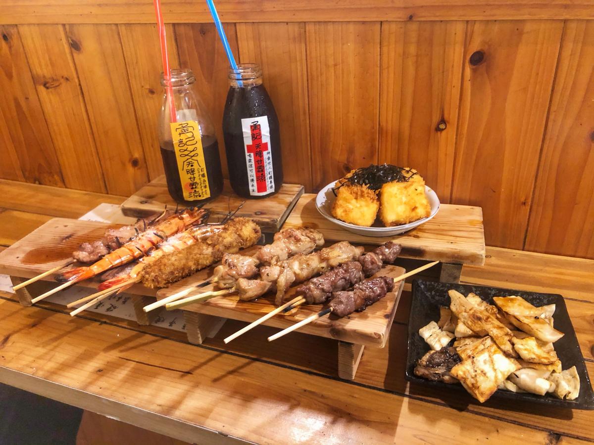 猶豫了很久,最後點了「牛肉串、雞肉串、烤蝦、牛串炸、杏鮑菇、親子丼、炸豆腐、烏梅汁」