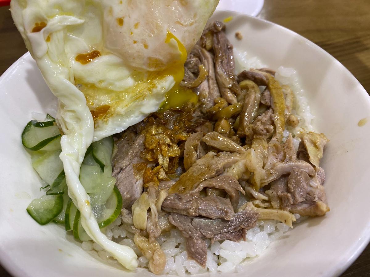 誤打誤撞找到了看似很夯的廟口鴨香飯,就連平日的人潮也都絡繹不絕,相當驚人。瀏覽了一下菜單,不是很平價的那種,一碗小的鴨香飯要$60,貢丸湯也要$45。這樣的價位還能高朋滿座,看來實力不容小覷,趕緊的點了一碗鴨香飯搭配荷包蛋外加一碗乾拌麵來試試。