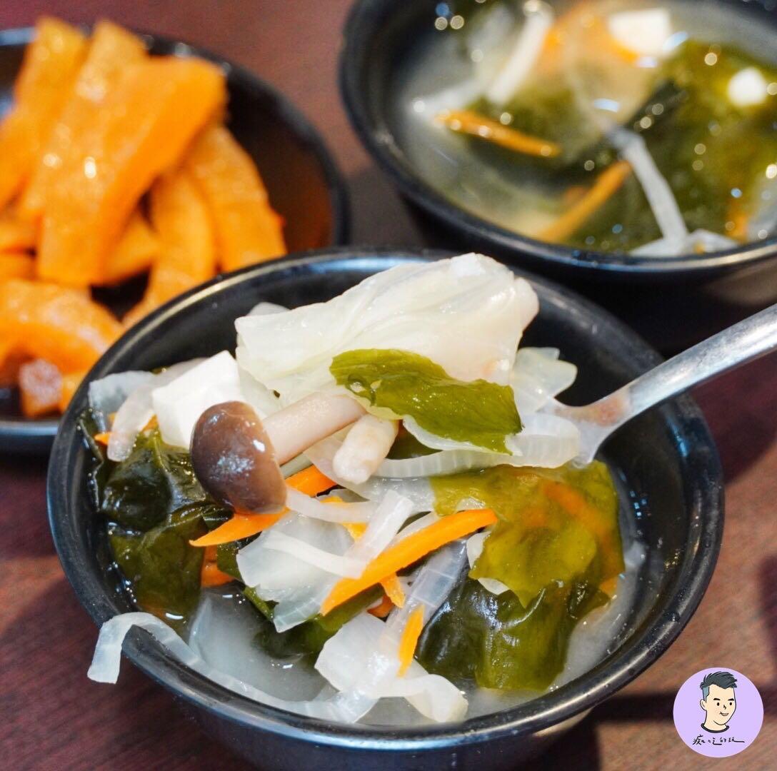 味噌湯中有海帶/豆腐/高麗菜/紅蘿蔔/鴻禧菇