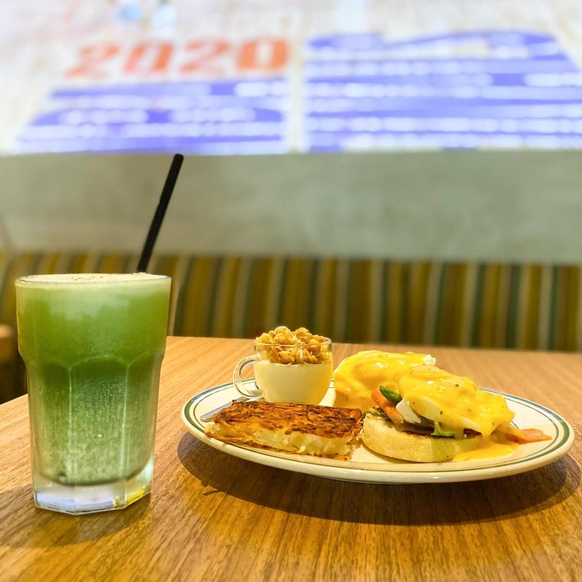 點主餐+100元可以點120內的飲品,其餘補差價,所以這杯抹茶拿鐵小小折扣了20元~點餐時可以直接說要調整甜度和冰塊,這點就給推,點了無糖少冰,嗯,果然是舒服的抹味,不到一百分但能過關。班尼迪克蛋搭配的馬鈴薯絲餅大加分!