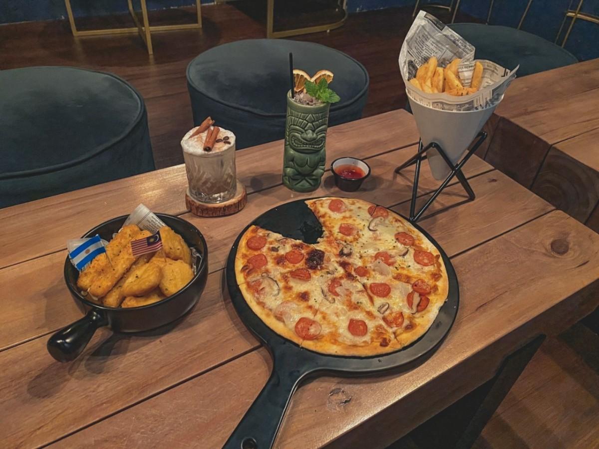 今天我的餐點是一份炸物、一份披薩、兩杯調酒!