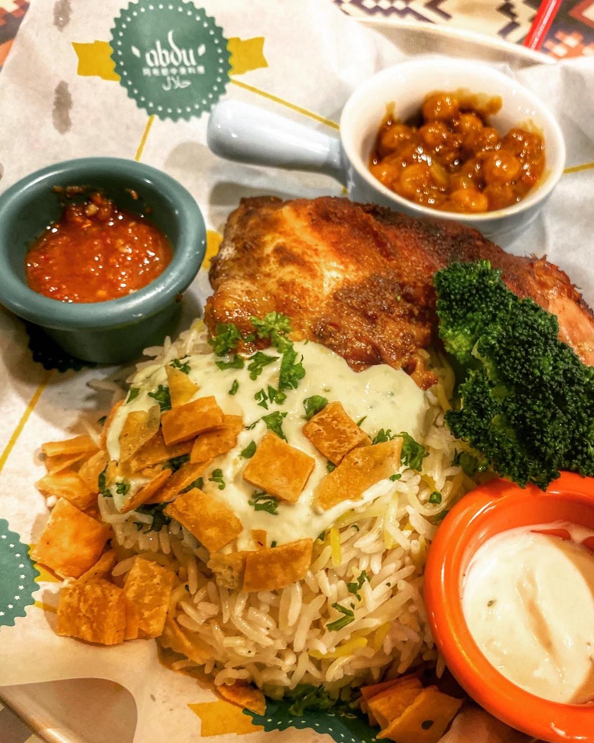 本日最推就是🤙🏻雞肉手抓飯:原本看到說是一隻完整的大雞腿還怕說有點難啃、想不到雞腿肉軟嫩的能用叉子一撕就骨肉分離,淋上特製白醬的#香料飯,煮的乾鬆爽口,再和一旁配菜咖哩口味的#鷹嘴豆泥 一起送入口、超級美味!