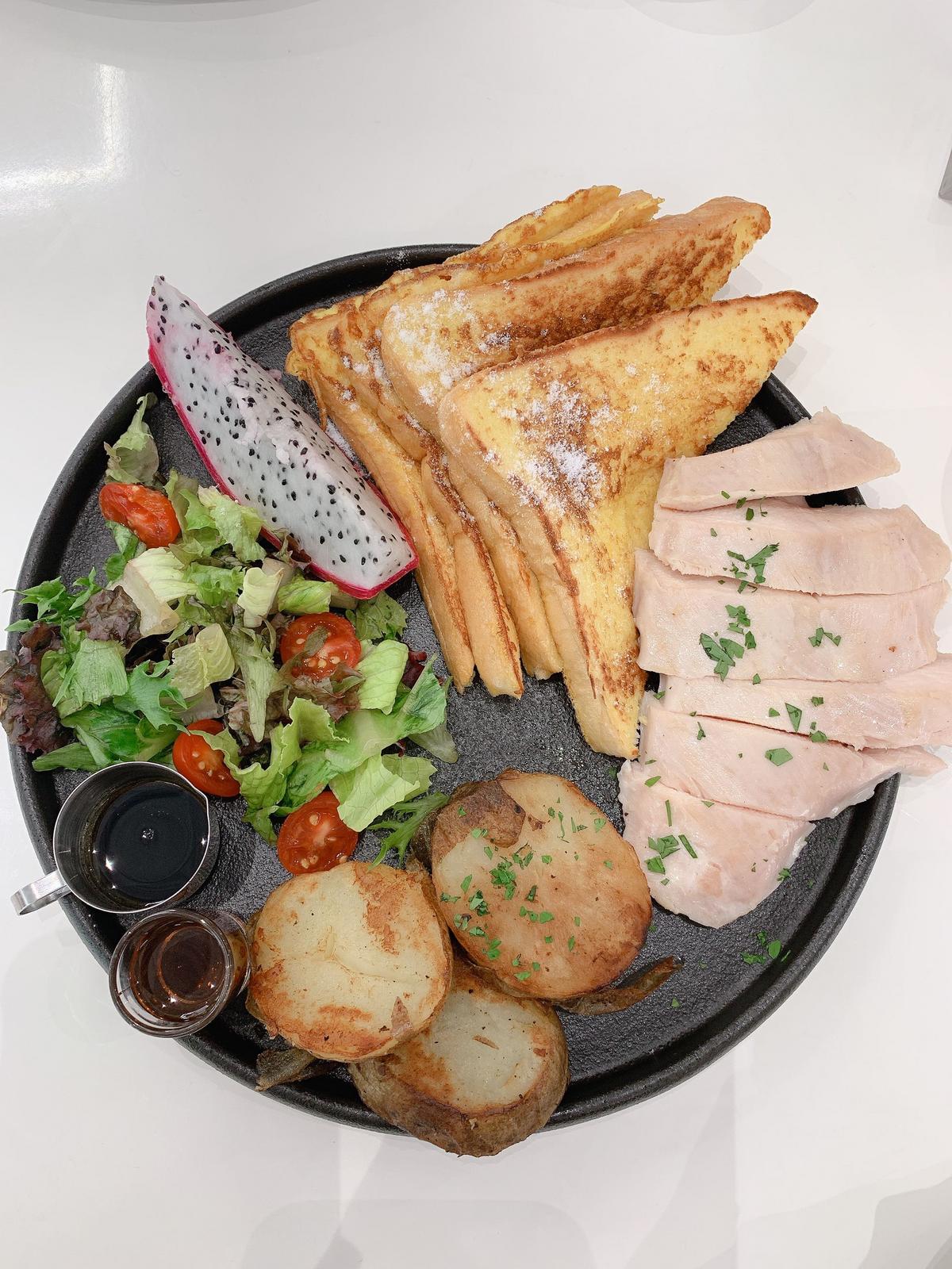 今日餐點—楓糖法國吐司和軟嫩舒肥雞胸肉🍴 適合小鳥胃女孩 環境安靜 半開放式廚房 用餐時間兩小時、低消一杯飲品