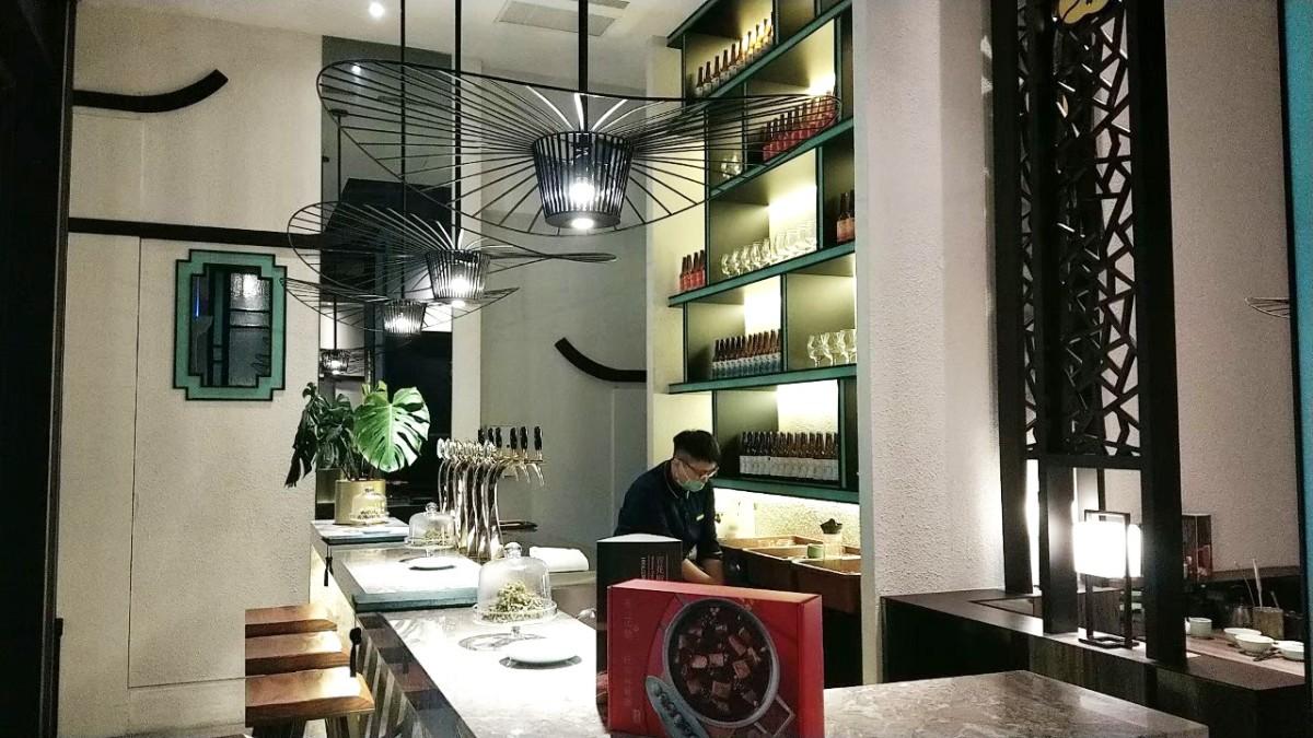 延續店主打青花椒色系 , 青色與黑色搭配 ,天花板掛著裸鐵油傘燈飾