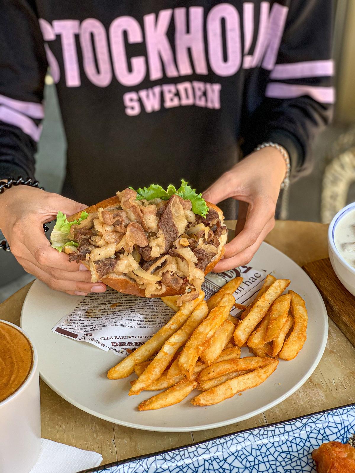 先來推薦店內人氣必吃「燒肉堡」菜名相當霸氣,不怕你吃🔥只怕你吃不完的吃爆雪花牛燒肉堡!!肉量相當驚人🍖(一口塞真的很困難🤣)雪花牛結合燒肉醬鹹甜開胃肉質軟嫩不柴,小高還升級脆薯只要$30元且均附一杯飲品,CP超高必吃!