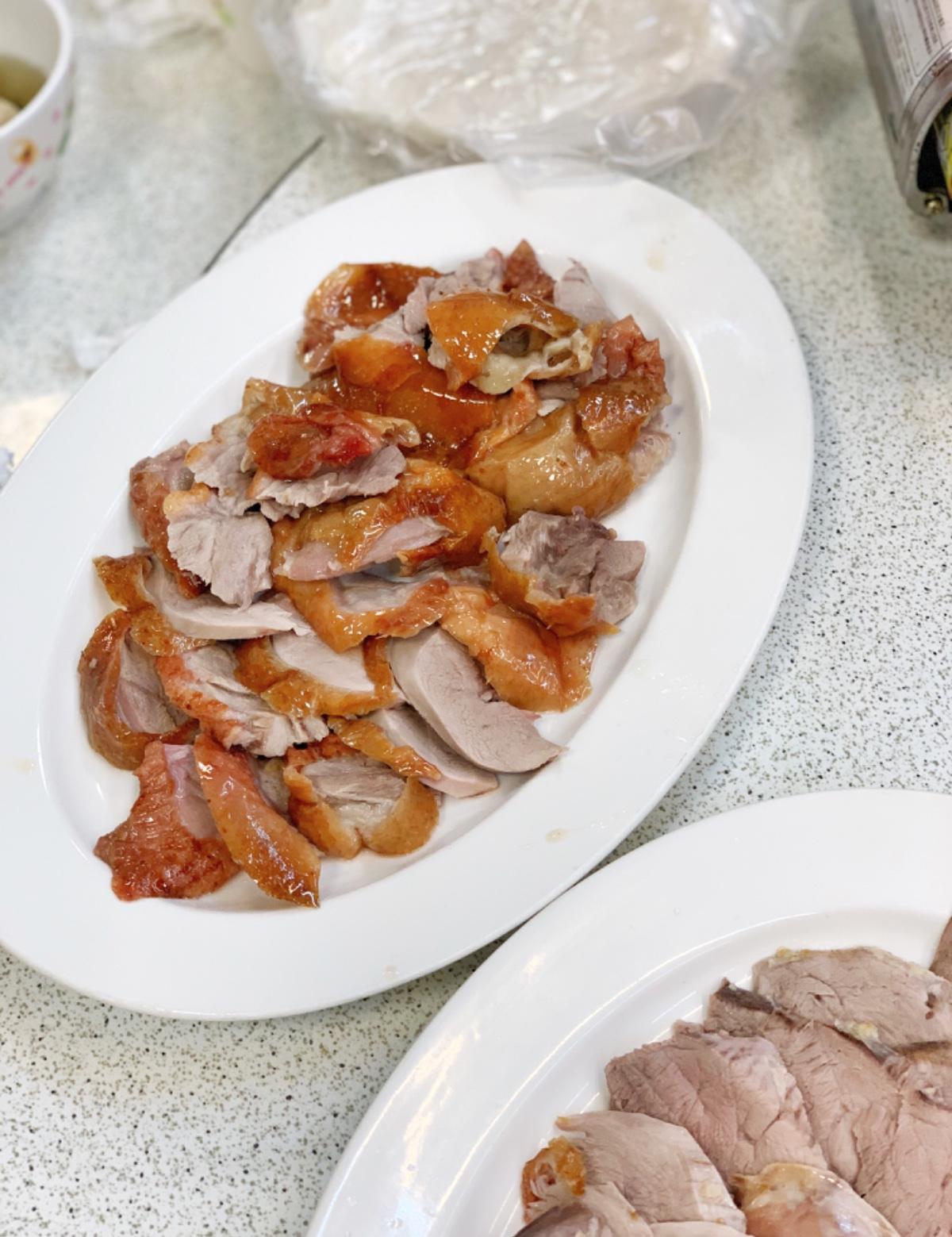 第一盤切皮的部分,沾糖吃,吃起來微甜口感但皮沒有很脆。再脆一點會更好吃