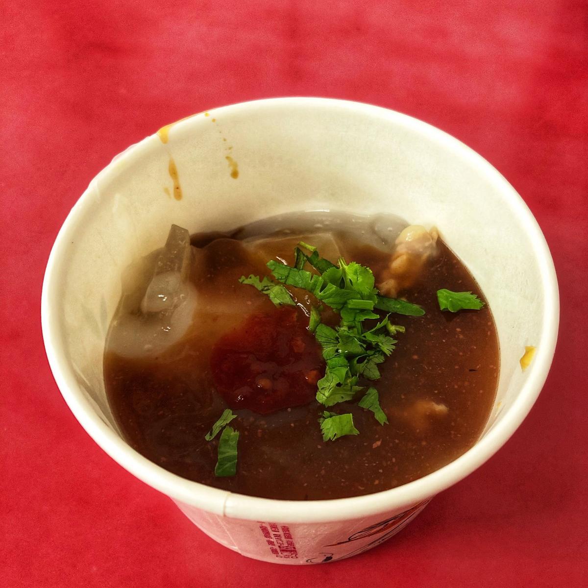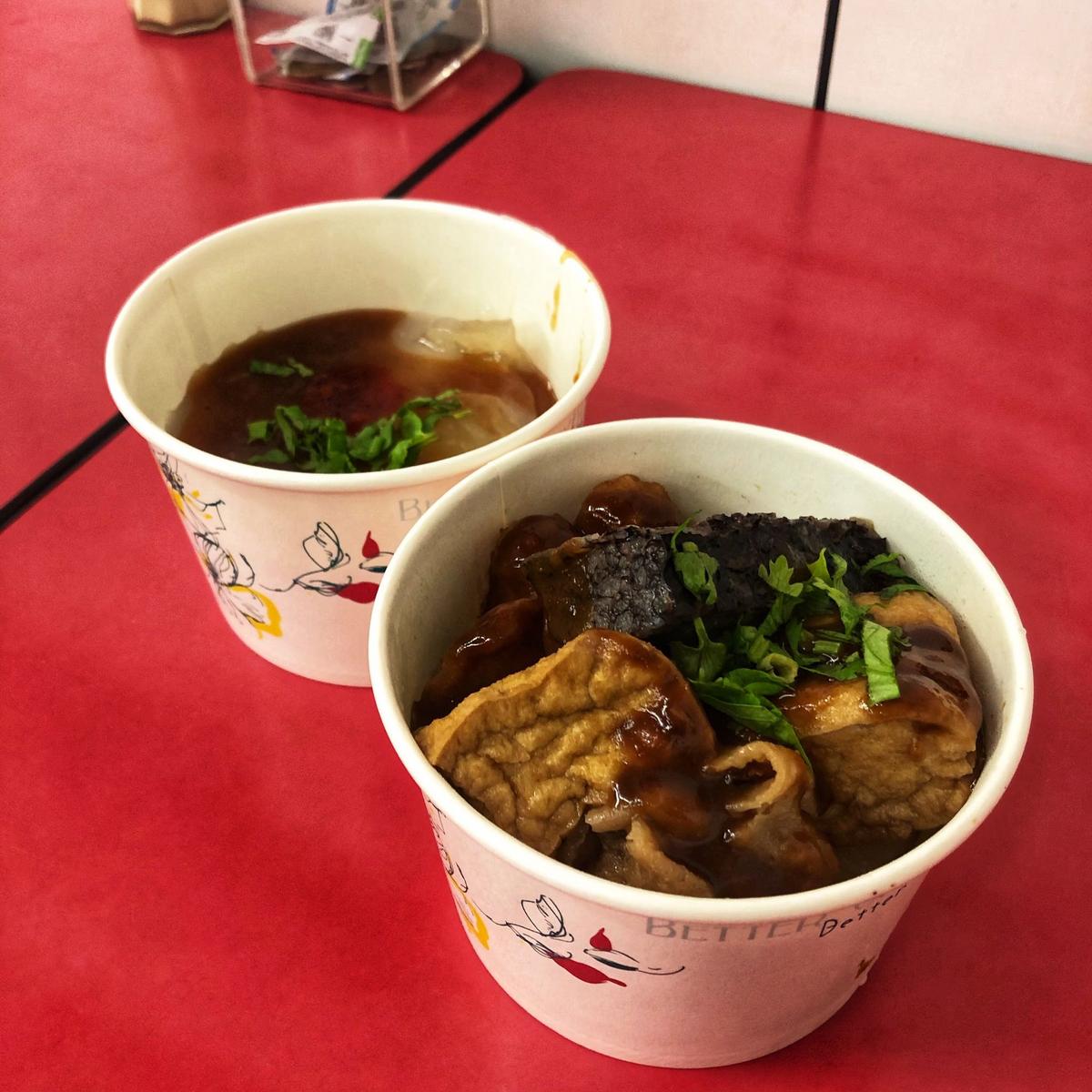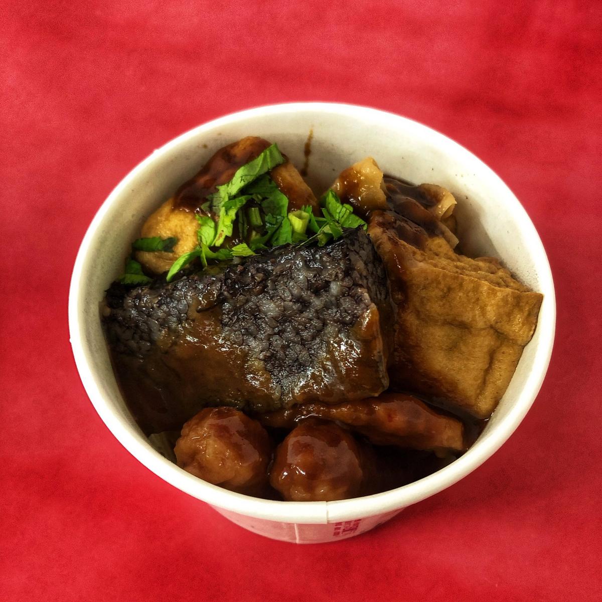 有蘿蔔、大甜不辣、條狀甜不辣、貢丸、炸餛飩、豬血糕等,每種配料都很扎實,塊頭也很大,淋上黑色醬汁,口味偏鹹。甜不辣,魚鮮味濃厚,有厚度不黏牙,口感很棒。#炸餛飩 非常特別,軟嫩又稍帶脆,大顆咬起來有飽足感,好吃。
