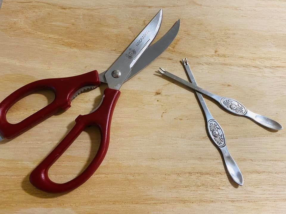 煲粥是一件很簡單的事,但殺蟹卻不簡單。所謂「功欲善其事,必先利其器」,建議想自己在家料理螃蟹的朋友,可以google「螃蟹剪刀」,上網或到家附近的五金居家雜貨行都買得到,我買的還附兩支螃蟹肉叉,擁有了它,就可以輕鬆拆卸螃蟹,把不能吃的內臟和髒髒的肺都先剪除掉,雖然不到優雅,但也不需費什麼力。但強烈建議,大家一定要小心螃蟹的鉗子啊~~,我二年前被瘋狂求生的螃蟹夾到,傷口紅腫去看醫生時。醫生說:「被夾傷再打破傷風已經沒用了啦,只能吃抗生素抑制發炎感染。」掛號時診所護士聽到我要看的項目,完全能微微感受到異樣的眼光…。