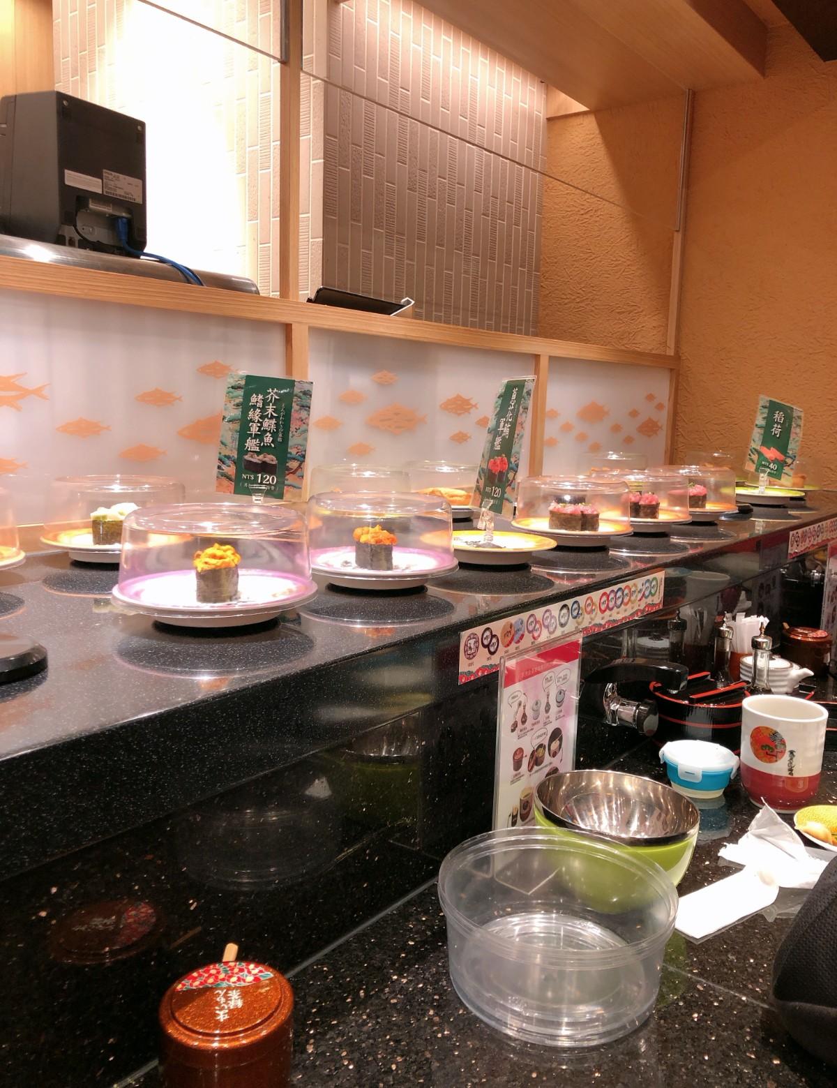 店內分為座位區以及迴轉吧檯區,座位區只能利用平板點餐,吧檯就可以選擇拿迴轉台上的或是用APP點餐,每種壽司都可以在點餐食選擇要不要芥末以及飯量的多寡,計價部分以餐盤顏色計價,從40-1000元都有呢!
