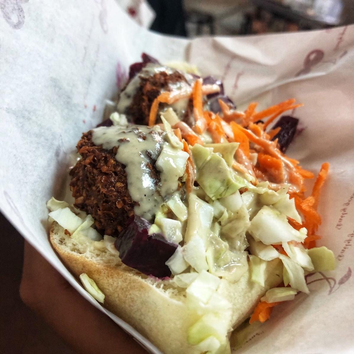 口袋餅裝著炸豆丸,以及滿滿蔬菜跟鷹嘴豆泥。厚實的餅皮,咬起來小麥味很重,也有咬勁。炸豆丸子非常好吃,現點現捏現炸,酥脆口感,綿密內餡,五香調味綜合在這炸丸子內,很香很特別!