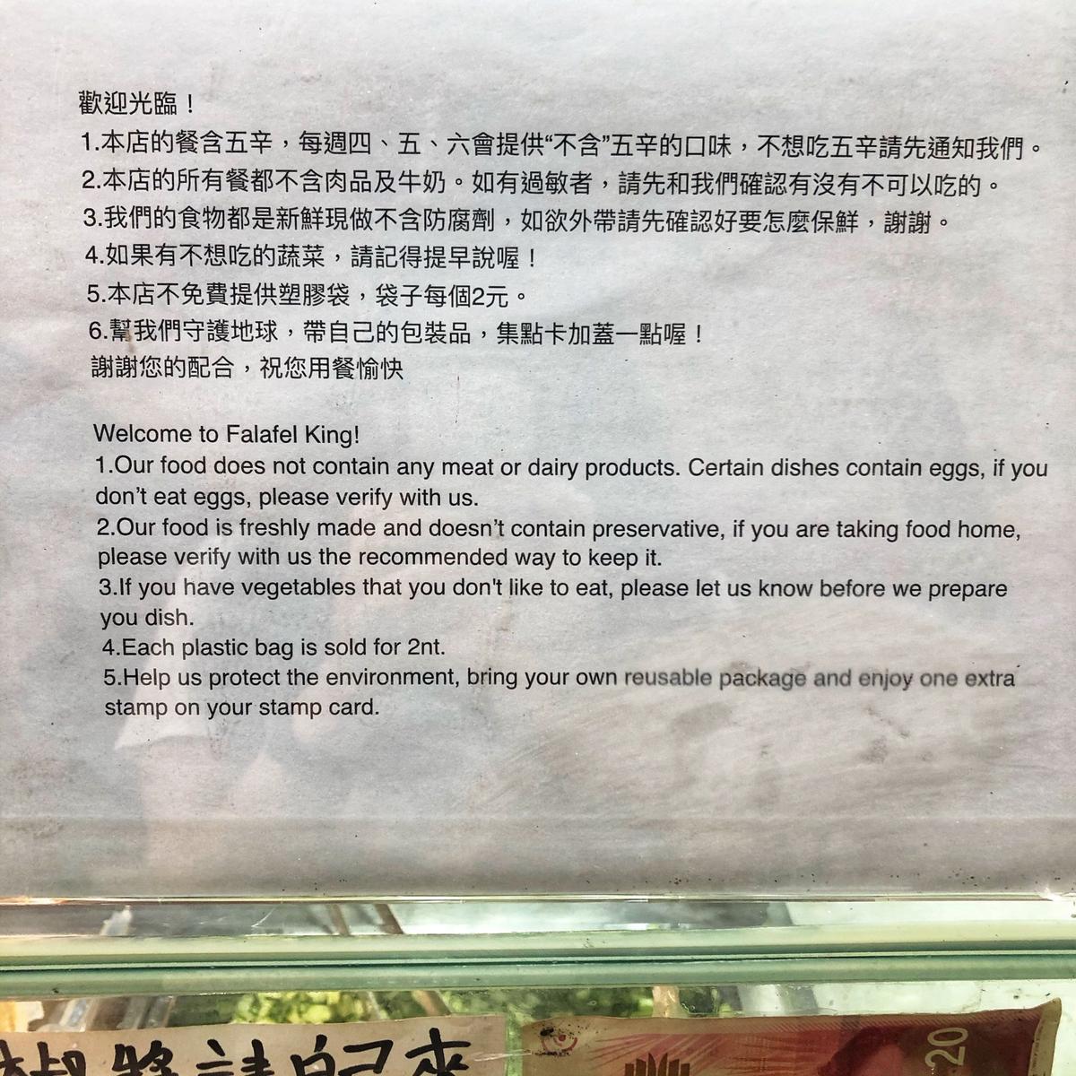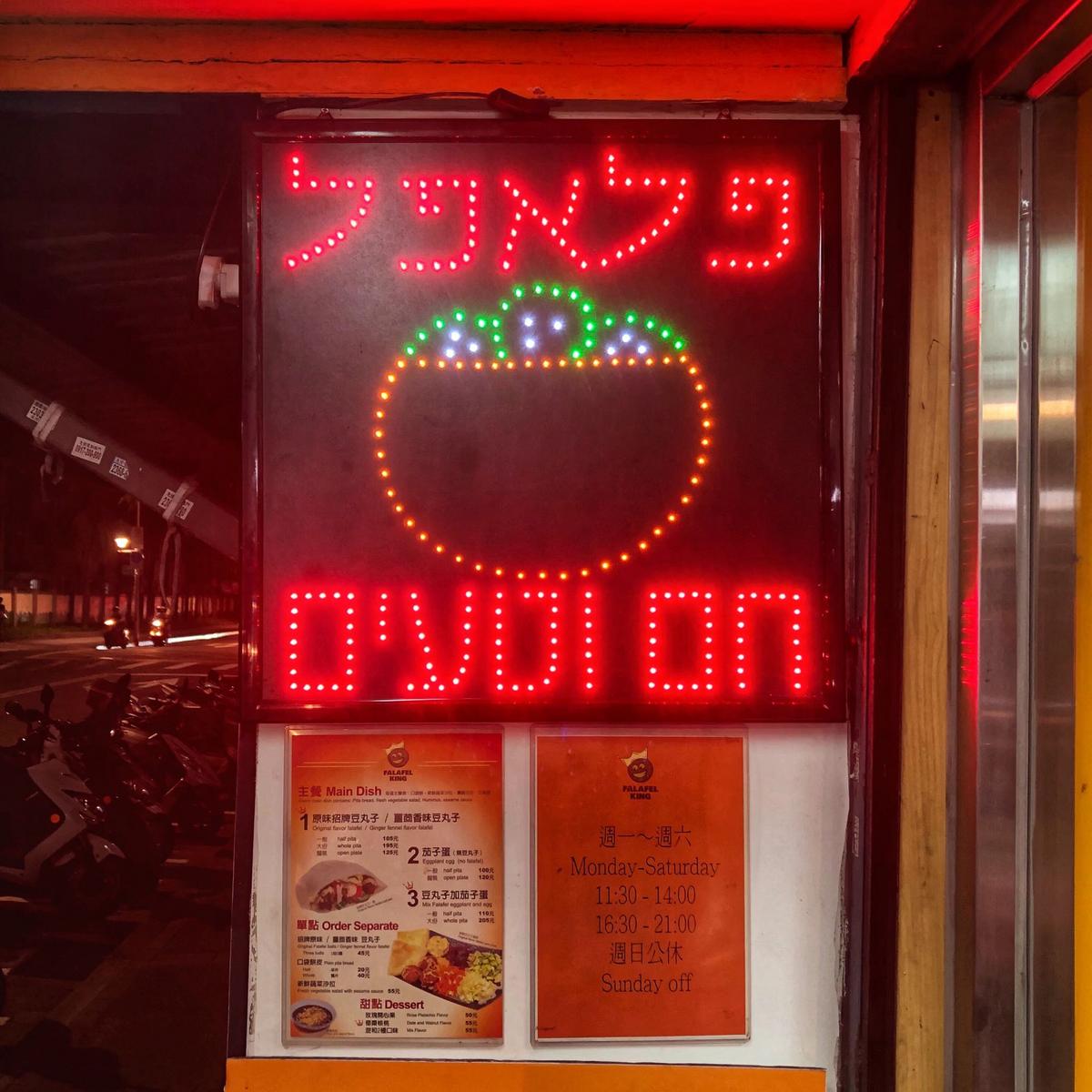 公館異國美食多,不只是移居台灣的外國人住處開店,更是來台交換生的聚餐營地。某傍晚,正愁不知要吃啥好,經過此店,看不懂招牌上的語言跟菜單圖片,正好外頭有一群上班族在聊天等外帶,上前詢問這餐廳在賣什麼,原來是以色列蔬食小吃店,好奇之下也入店品嚐看看味道如何。