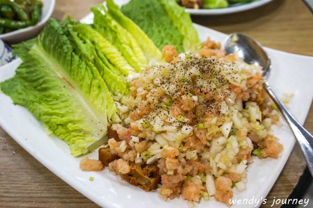 我超這種涼拌包生菜的料理,吃起來特別清爽,像這道蝦鬆裡,有蝦子、生洋蔥和油條等主要食材搭配,三者味道調合的恰到好處,讓人忍不住一口接一口,這盤我自己一個人全部吃掉也很可以!推薦必點!