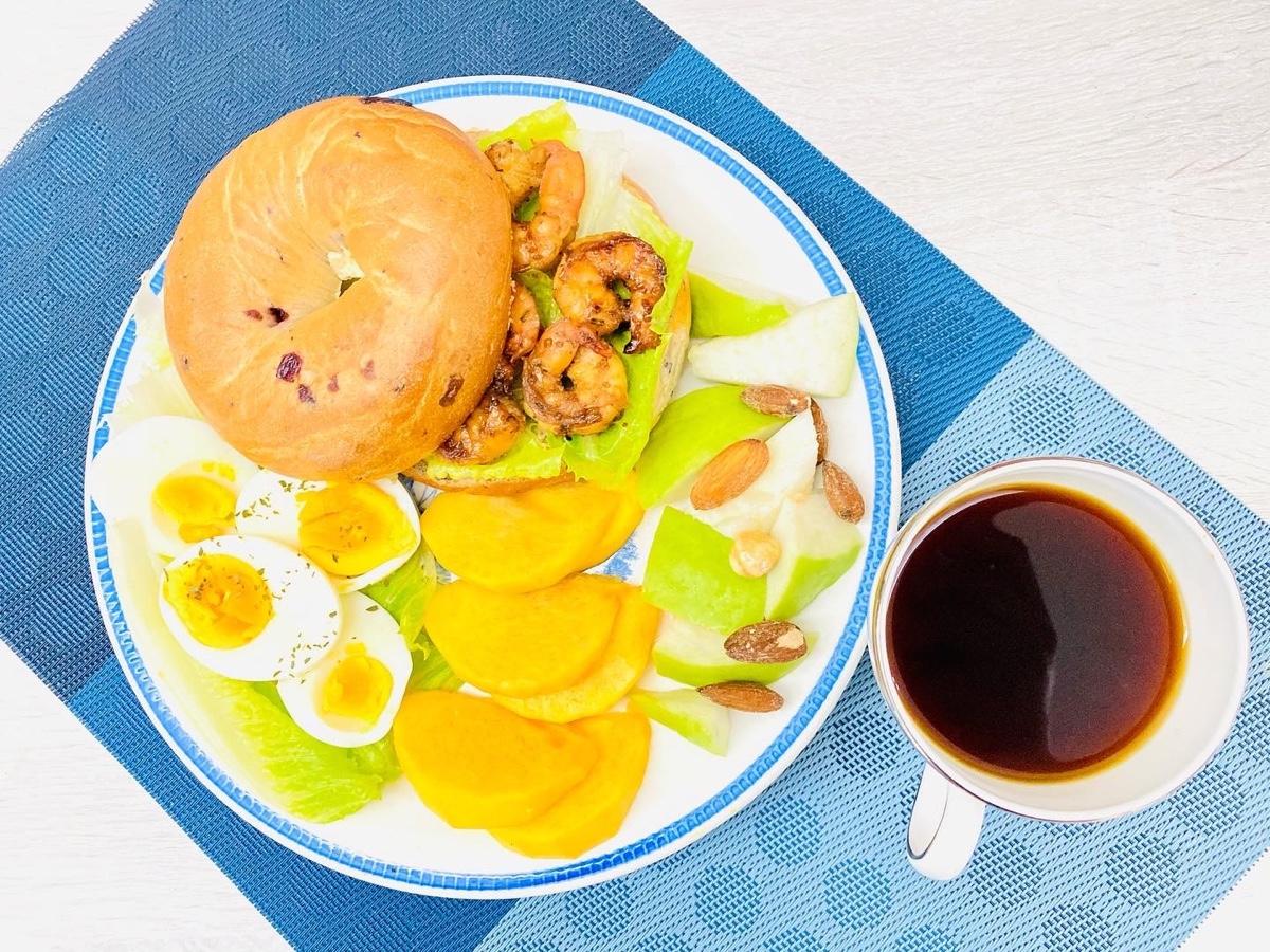 手作早午餐/朝食2020/10/26醬燒鮮蝦水煮蛋生菜🥬核桃奶油貝果