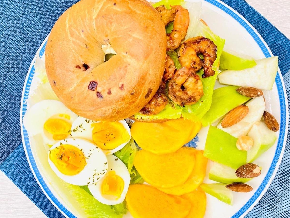 主食:醬燒鮮蝦水煮蛋生菜🥬核桃奶油貝果