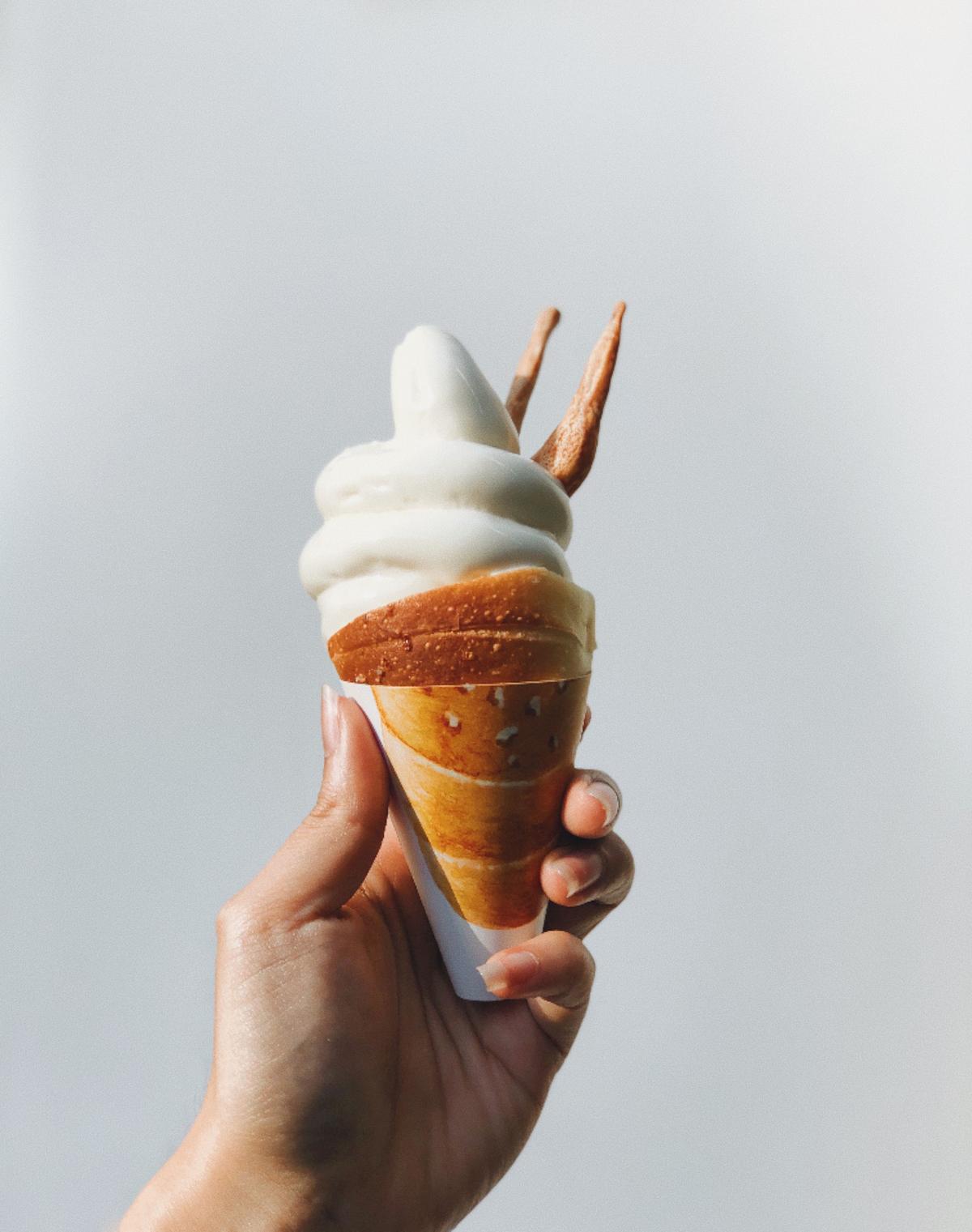 一禾堂的招牌豆乳, #海鹽豆乳冰淇淋 有濃厚的豆乳香,而且甜度近乎微甜,不甜膩,上面撒上海鹽口感也多了些,交錯的豆乳與海鹽鰻不錯的耶,尤其配上麵包底是海鹽奶油捲,是一禾堂的招牌,奶油香甜鬆軟的麵包很好吃💯