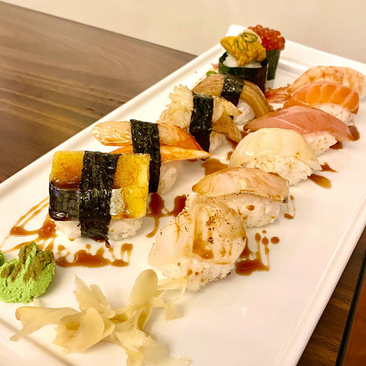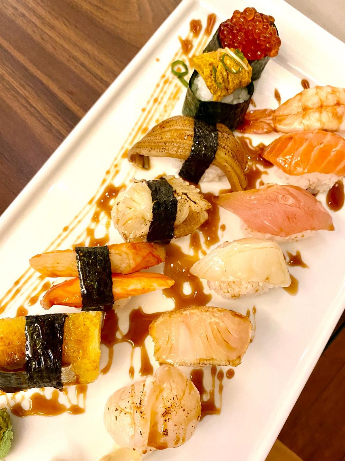 280元可以吃到12種不同的海鮮 不僅擺盤美 內容有生食也有炙燒的口味 真的是很有誠意的一道 強烈推薦一定要試試 握壽司的醬是用日式醬油先抹上 所以不會附醬油 可以直接配點哇沙米即可