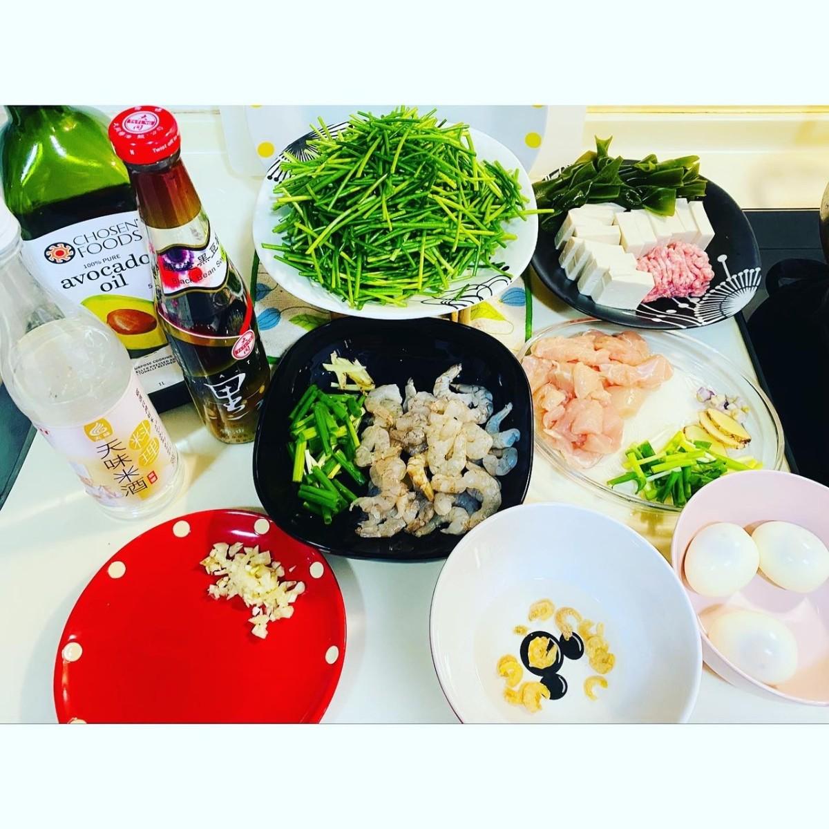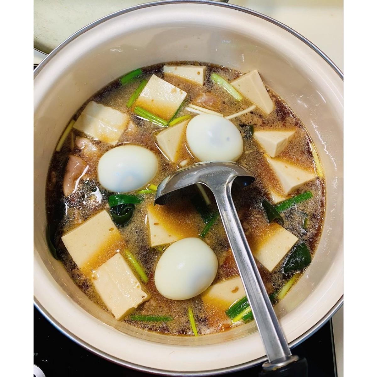 - 依序放入海帶、百頁豆腐、雞腿肉、薑、水煮蛋、蔥