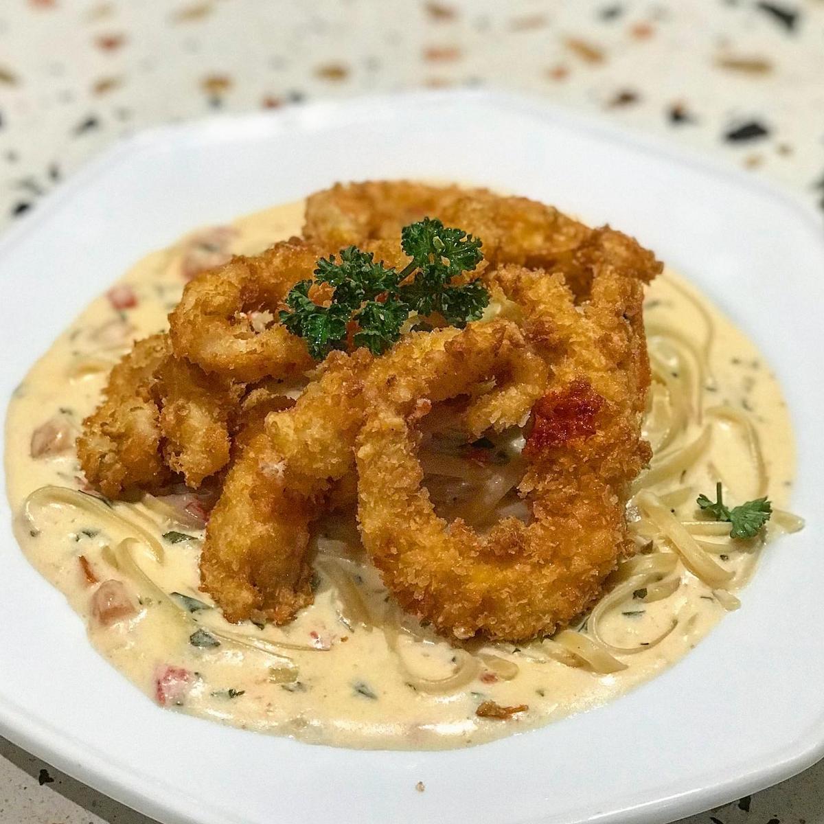 這道的名字真的是淺顯易懂🤣,這個炸工真的是一流~外皮真的酥脆到不行!白醬很濃郁帶點青醬跟蒜香的味道,層次很豐富,麵條是寬扁麵~吃起來硬度剛好,不會過硬過軟👍🏼