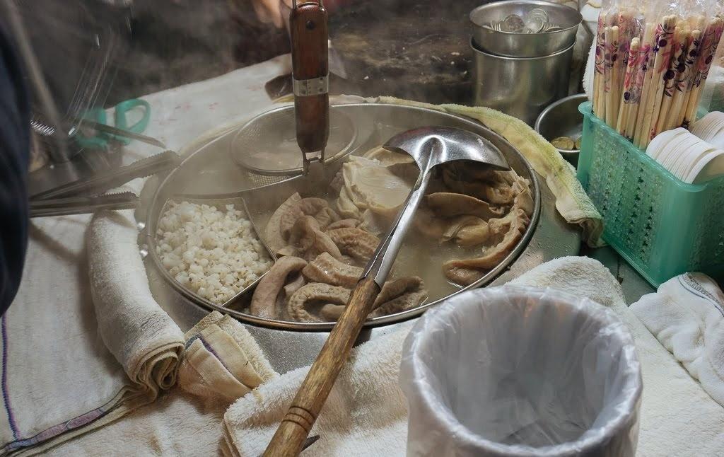 攤上主要供應兩大類料理,蒸籠上有著大腸圈、脆管、豬舌頭、豬大腸、嘴邊肉、生腸、肝連,及豬肚帶...等,一旁則是超大一鍋的四神湯,攤上沒有制式價目表可參考,加上老闆娘忙我不好意思逐樣問,所以價格部分就請有需要的朋友自行詢問囉!