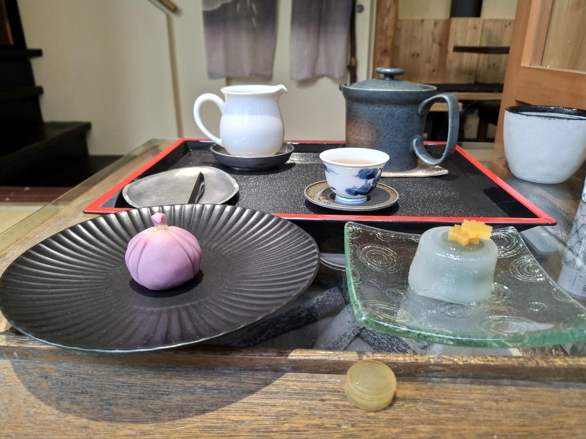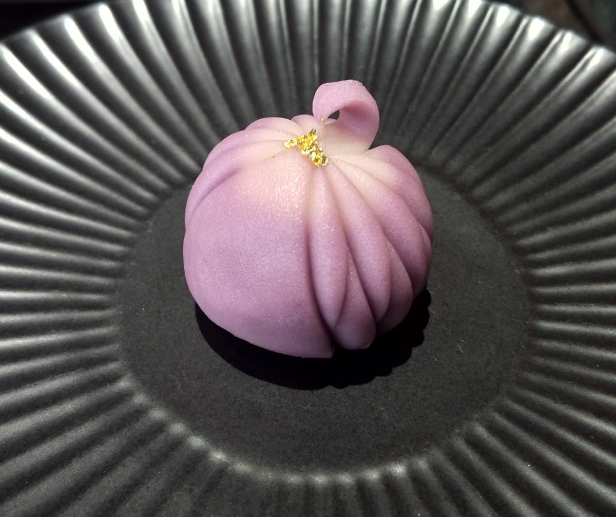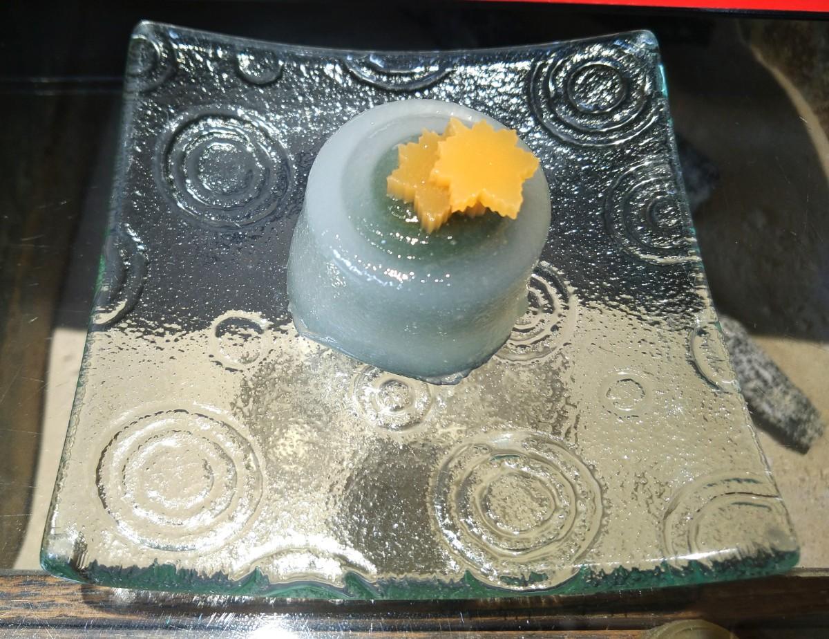 時序來到深秋時節,天清氣朗,氣溫涼爽,正是散步的好時候。以透明的厚玻璃盤盛裝的竜田川之秋,潺潺流水上正有落下的楓葉隨著水流漂過,就像一幅山間的秋天景致。在深秋夜空中閃閃發亮的天蠍座,圓胖可愛的外型也讓人會心一笑。一壺熱茶,以及美味的和菓子,正好能為愜意的散步行程劃下美好句點。