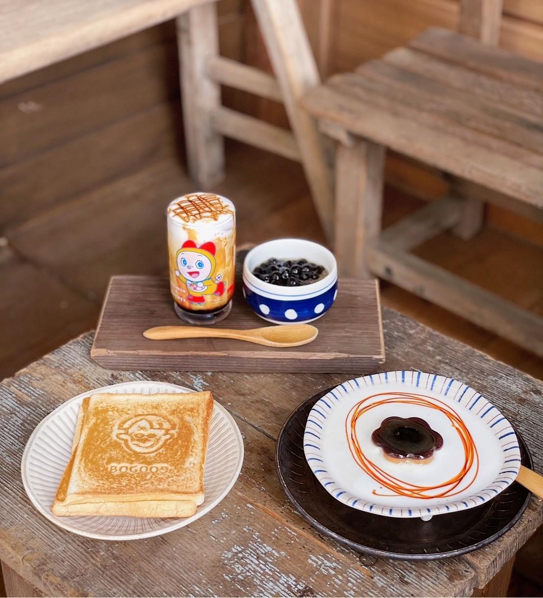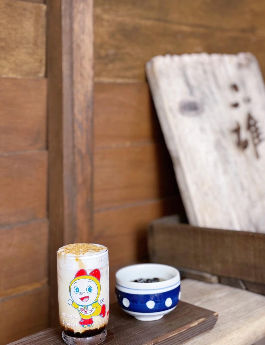 店裡招牌飲品牛乳波波系列,用童年卡通多啦A夢的玻璃杯裝著,這次點的是哆啦美「炒糖牛乳波波」,最上面為奶泡,而下面是炒糖牛乳,喝起來帶有微微的焦香味,比黑糖牛乳更有味道,大波霸與透明小珍珠放置在小碗中,可自己加進鮮奶裡。