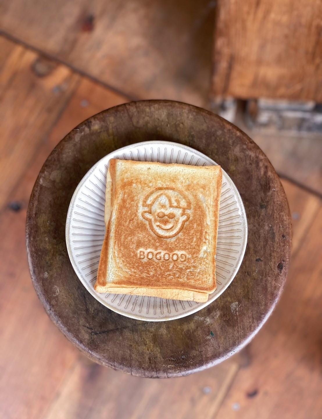 「叮哥」,沉浸在烏龍奶裡的布丁好療癒,整體味道非常搭,濃郁的烏龍奶甜度剛好不膩口。熱壓吐司上有著經典波哥的LOGO,外酥內軟的肉鬆蛋吐司。