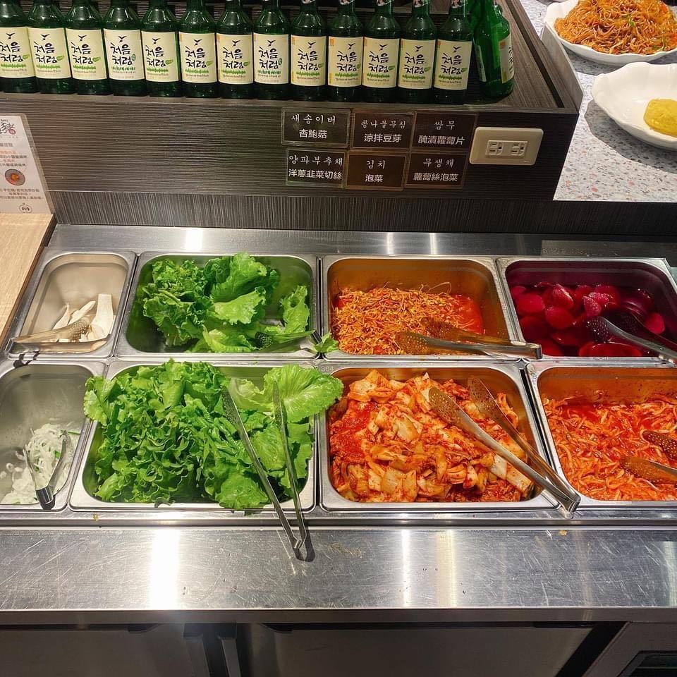 「生菜🥬」、「韓式泡菜」、「涼拌豆芽」、「醃漬蘿蔔」、「蘿蔔泡菜」、「杏鮑菇」、「洋蔥韭菜切絲」。