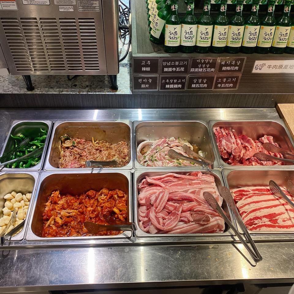 「梅花豬」、「豬五花」、「蒜泥豬五花」、「醬醃牛五花」、「牛五花」、「辣醬雞肉」、「蒜頭辣椒」