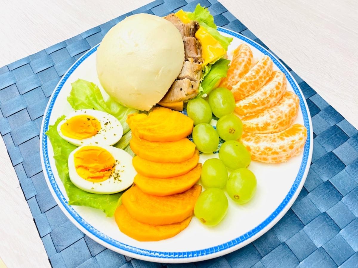 主食:烤豬肉排水煮蛋生菜🥬起司🧀️花生醬饅頭