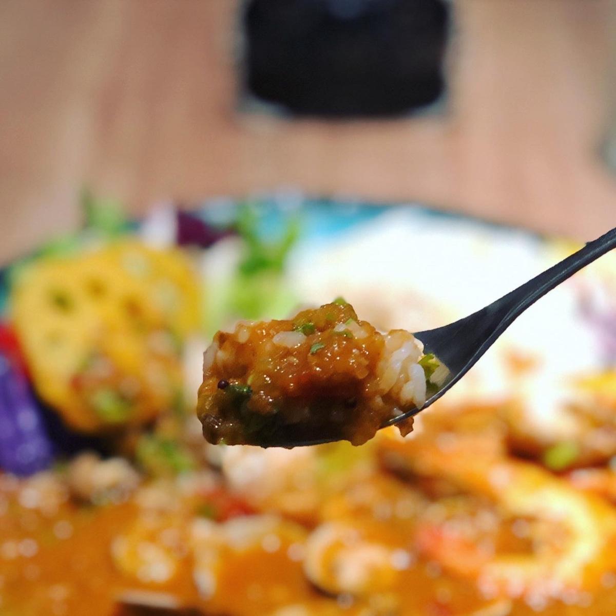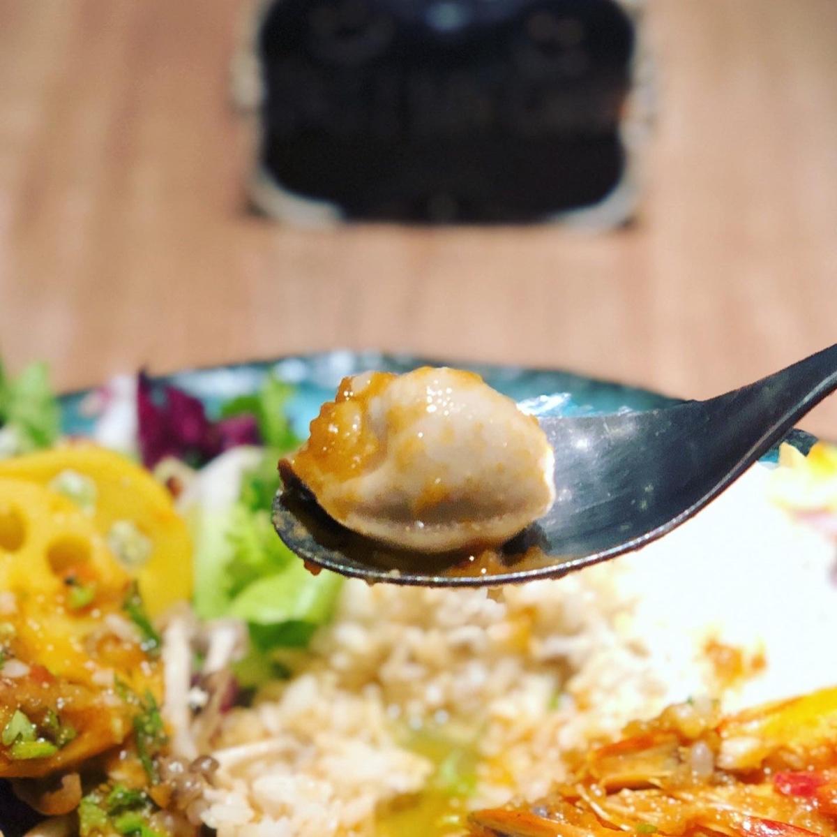 稻町家的咖哩很特別欸,跟傳統用麵粉去炒出來的咖哩不一樣,是無麩質、用新鮮香料與高湯所熬煮熟成的香料咖哩,所以比較不是濃稠的那種。除了香料以外咖哩中還加了番茄和香菜(可以不加)來增添風味,雖然有點小辣不過我超喜歡的啦我特愛香菜~把盤子裡的咖裡都刮乾淨吃光光了XD
