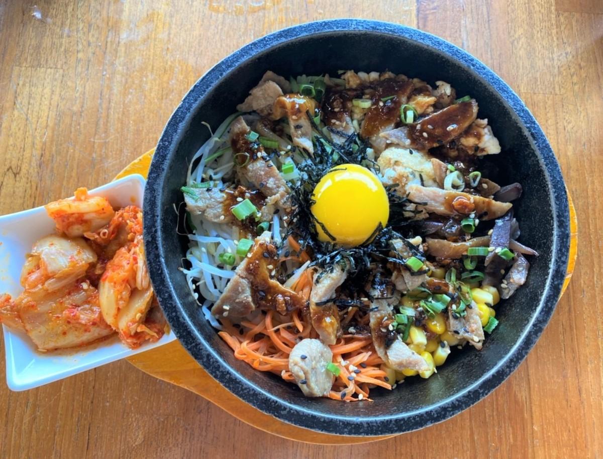 上桌的時候就像石鍋拌飯,中間有生雞蛋需要均勻攪拌開,石鍋熱度很夠所以真的會有脆脆的鍋巴,豬肉片應該有事先醃過,帶一點甜味,單吃拌飯的醬油味重,要加入泡菜拌勻才有辣度,更好吃。整碗的份量足夠,吃完很撐。