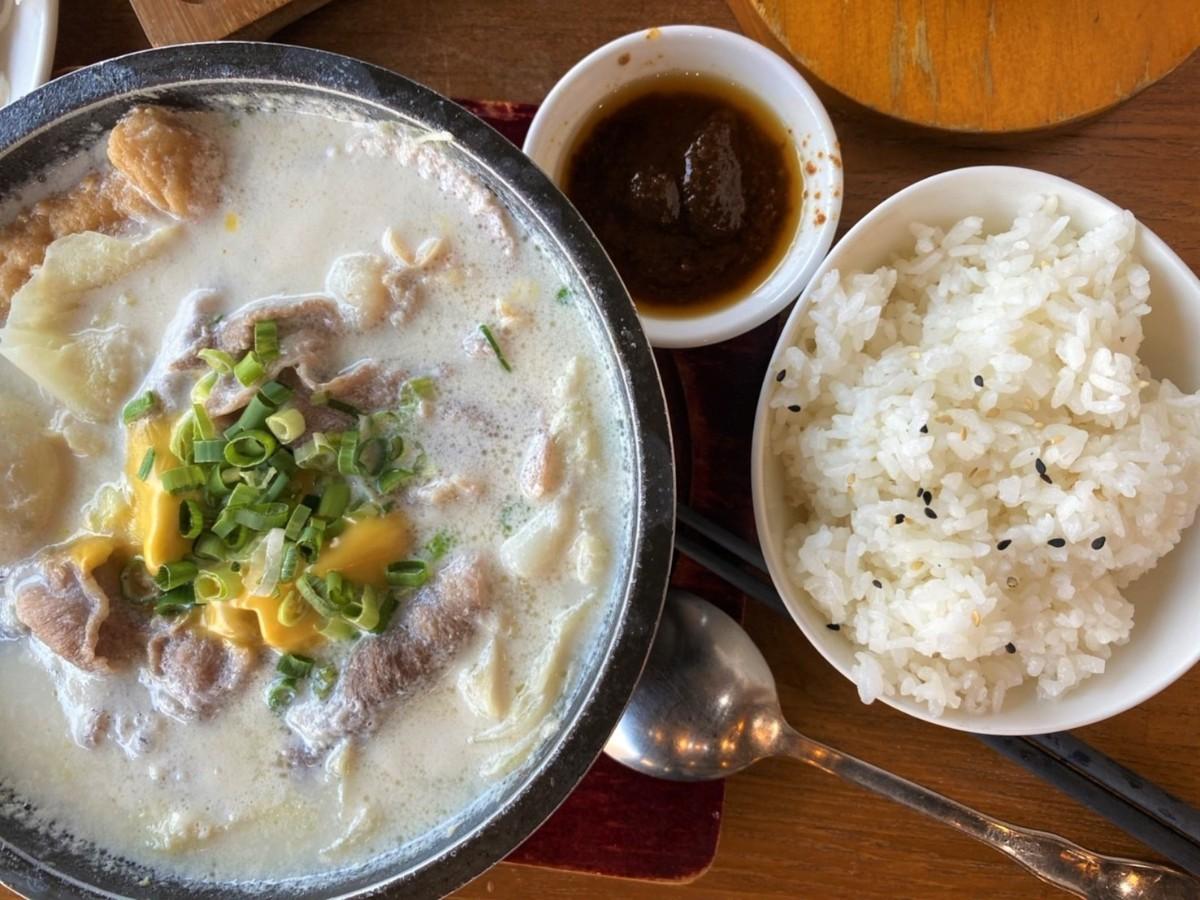 牛奶鍋是老高最愛的餐點,因為肉片放在鍋裡的時間比較長,所以選豬肉或雞肉會比牛肉好吃。牛奶鍋底還滿香濃,鍋裡的高麗菜、配料都很多,光是吃鍋就很飽了,附餐的白飯通常都吃不完。