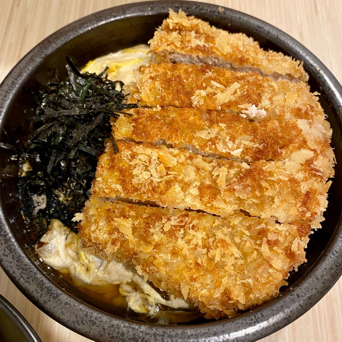 炸豬排炸得外皮酥脆 內裡軟嫩多汁 下面還有滑蛋融在飯裡 讓人忍不住一口接一口 分量夠很有飽足感