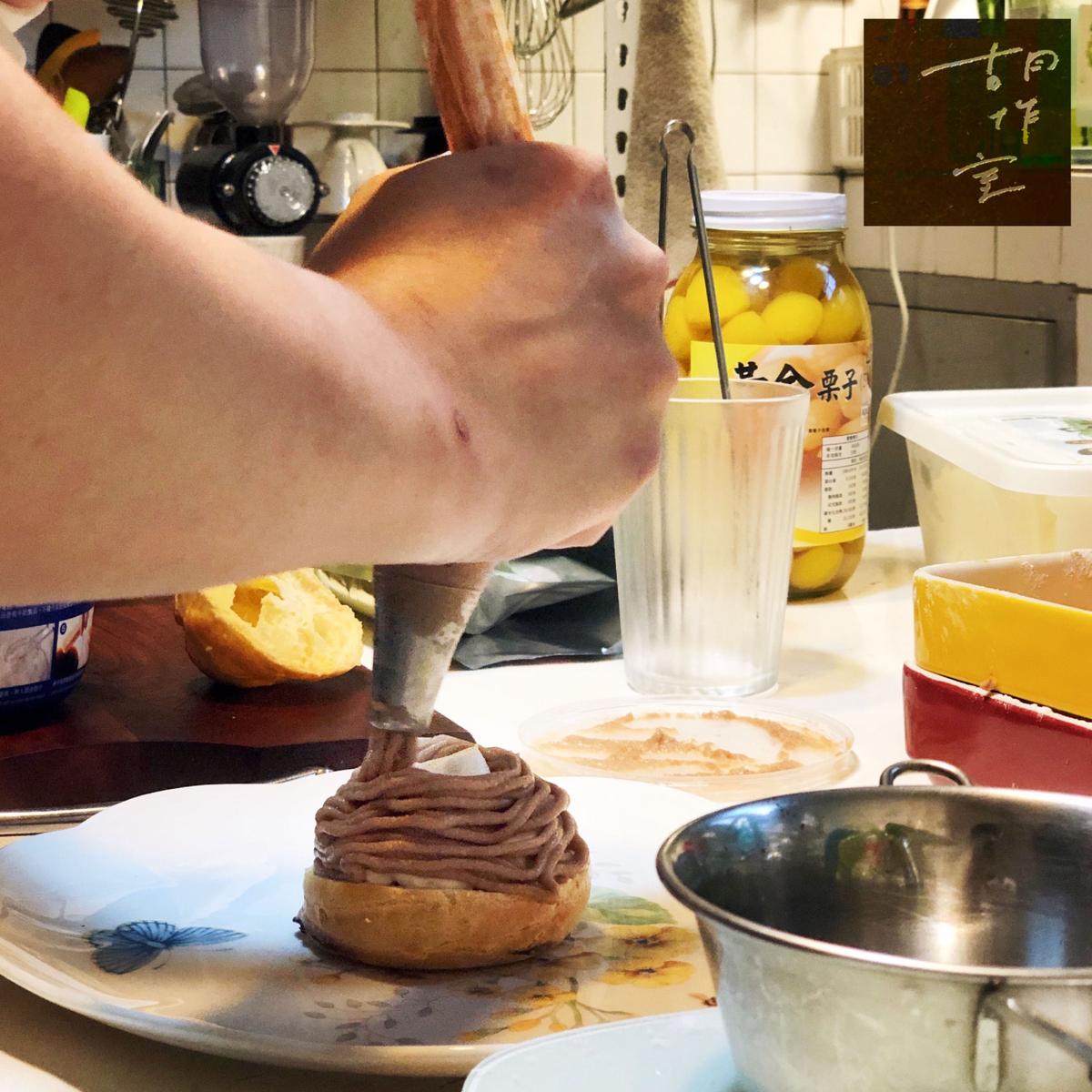 再用洞洞花嘴擠上傳統麵條狀的栗子鮮奶油,