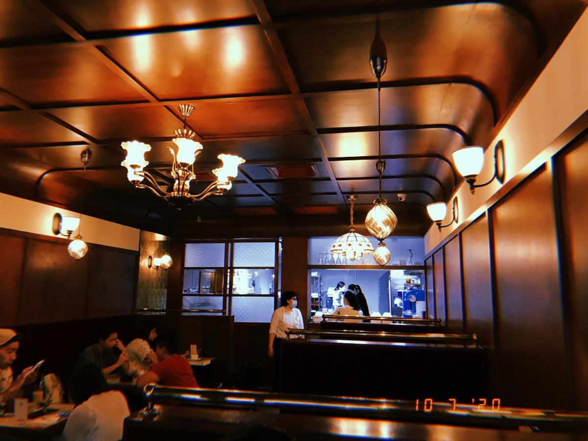 推開木門,映入眼簾的是整間木作裝潢,搭配水晶燈,黃光映照出復古昏黃的感覺,