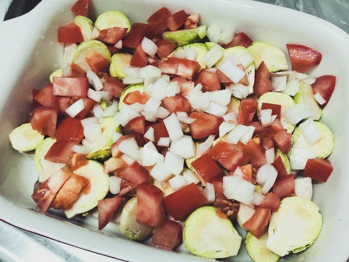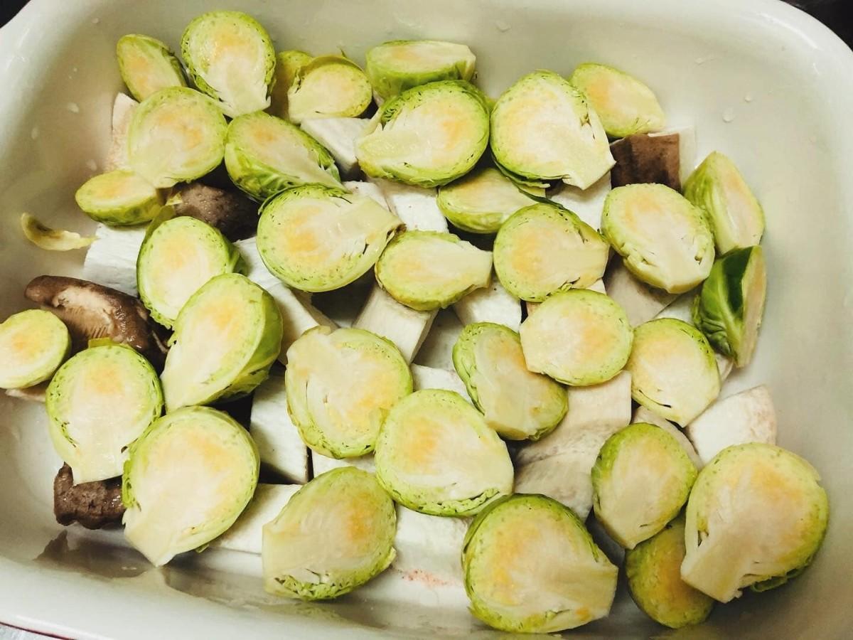 烤箱預熱,杏鮑菇切塊鋪底,球芽甘藍洗淨對半切,西紅柿洋蔥切小塊,一層層鋪上,撒上調味料, 230度烤30分鐘,完成,攪拌,開吃。