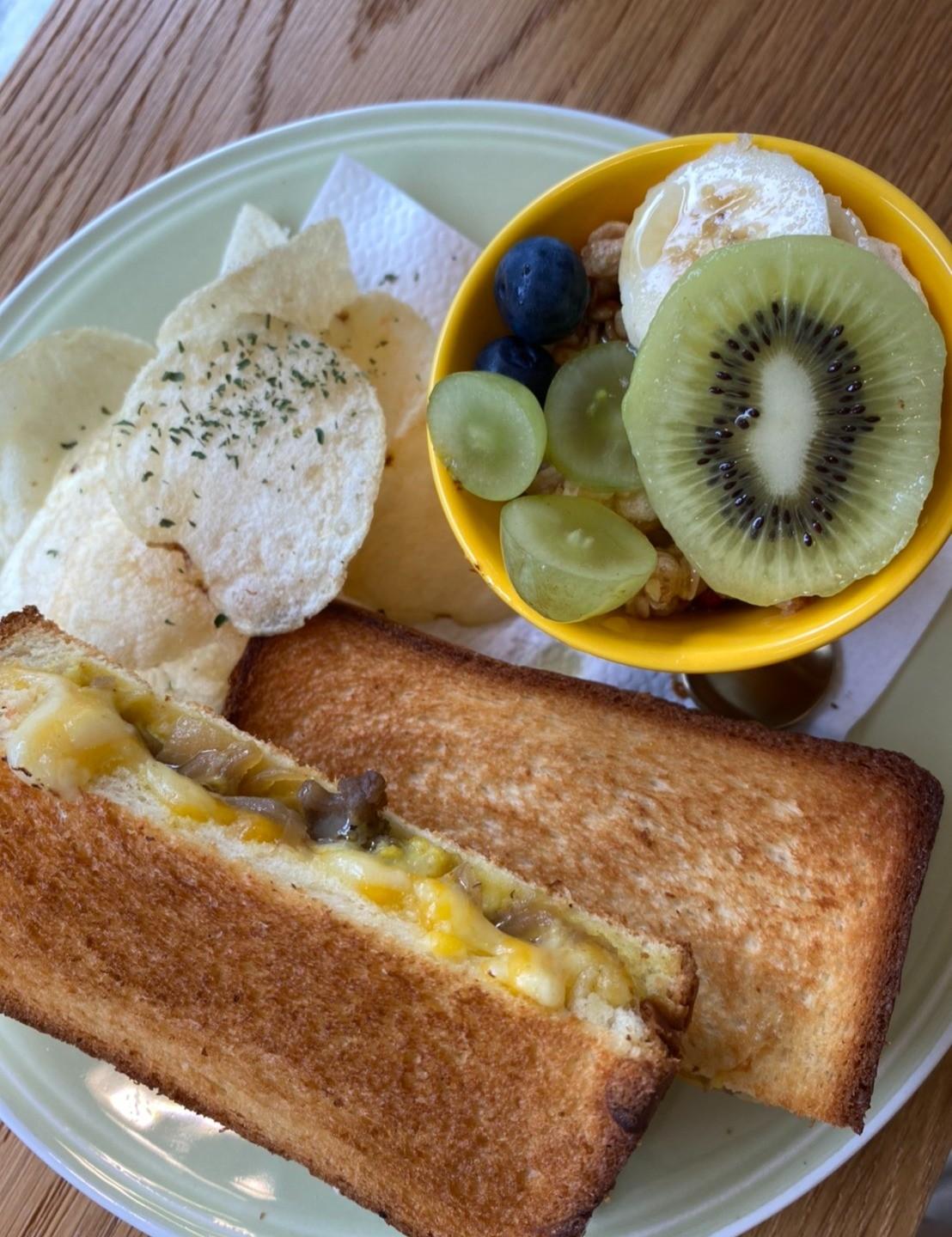 除了三明治之外,還會附上洋芋片和一小杯水果優格。優格裡的水果很新鮮漂亮,除了水果還有穀棒麥片,所以整體口味偏甜,對於像我這種不喜甜的人就無法單吃,要配水或黑咖啡才能把它吃完。
