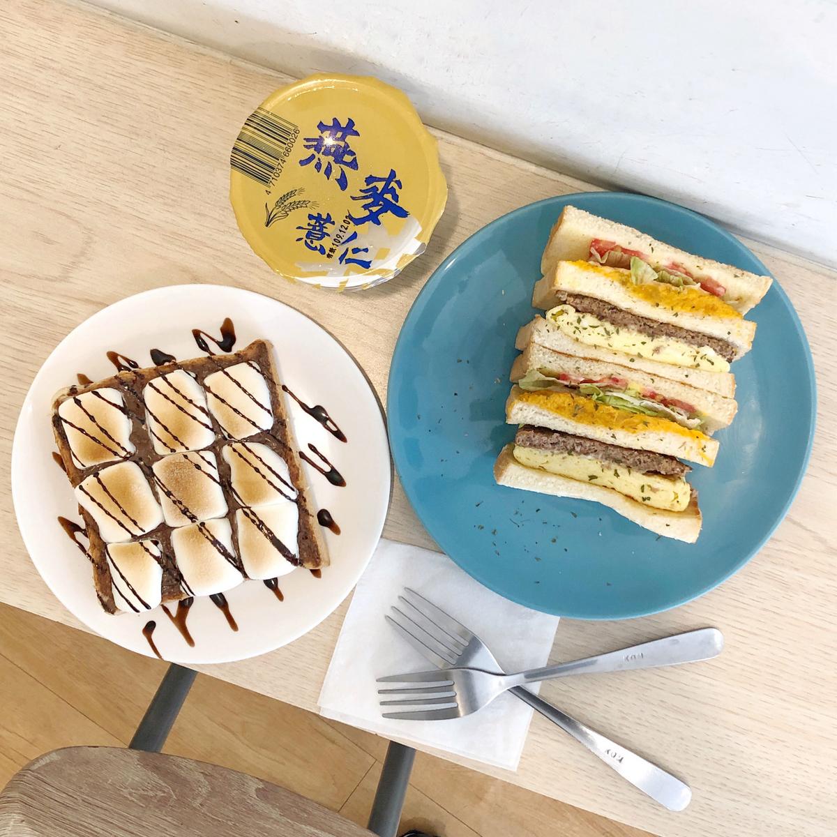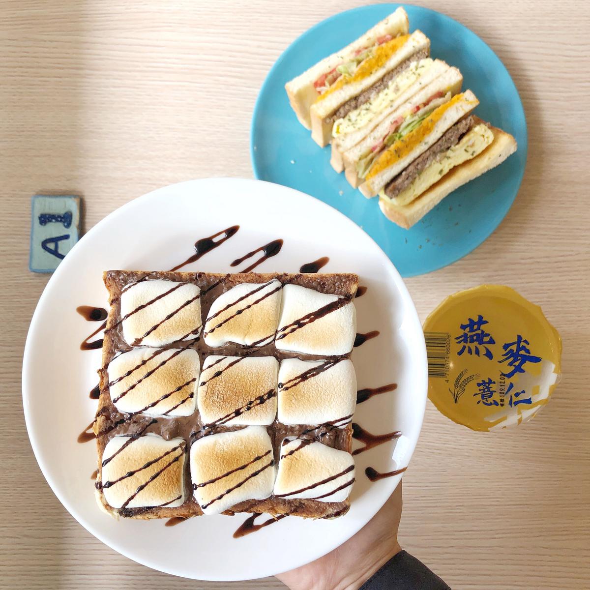 看起來還真邪惡的早餐,厚片先抹上巧克力醬🍫厚鋪了肥肥的棉花糖🍡烘烤,經過加熱的棉花糖黏附在厚片上面,輕輕扯了一下厚片就會有牽絲的港絕,搭配濃濃的巧克力淋醬,雖然吃甜甜心情會很好😙,但是巧克力🍫棉花糖的熱量…(嗯!不能只有我胖),馬上切成N等份找同事分食hahaa
