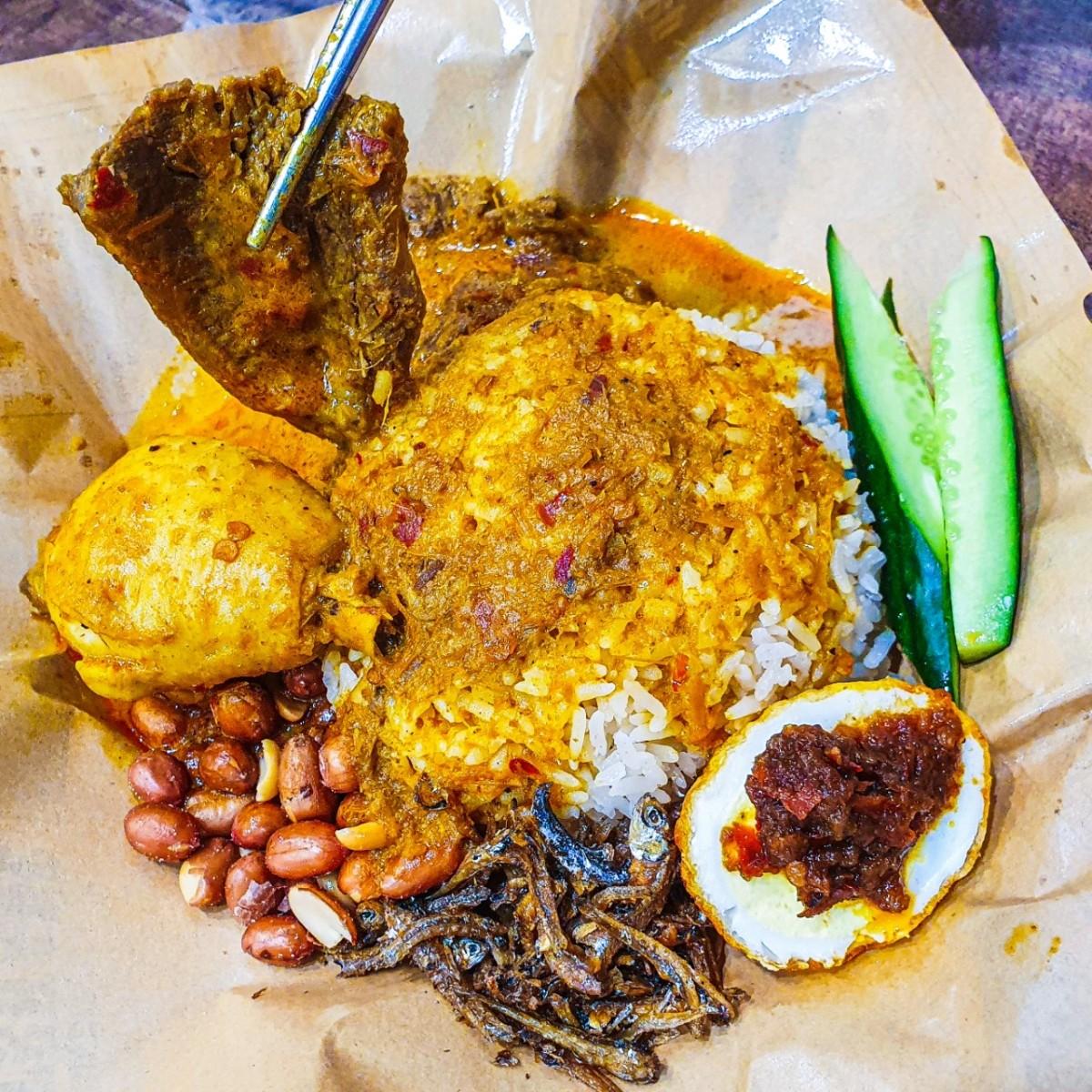 附上花生、小魚乾、黃瓜及炸得酥黃的參峇蛋,好吃👍