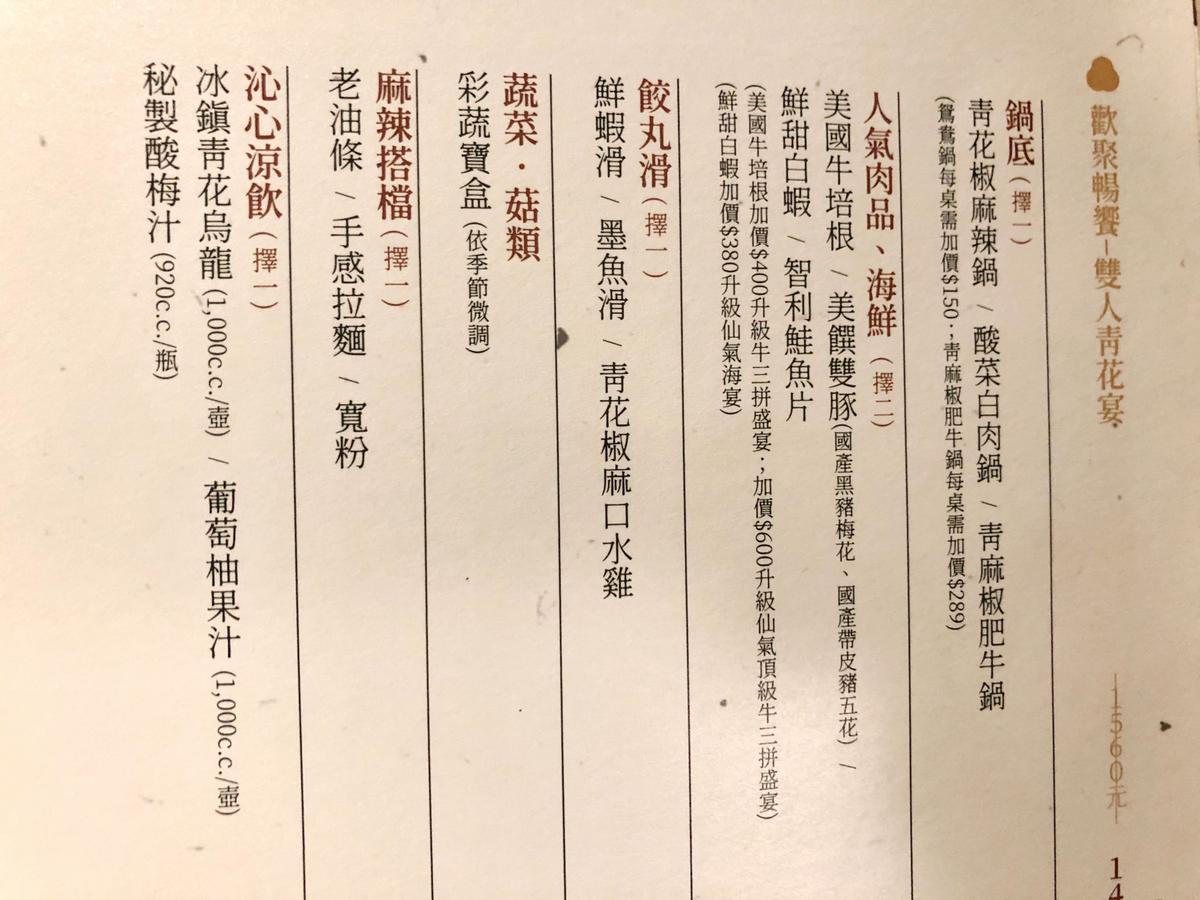 著名的 #青花驕肥牛鍋 這次沒點,因為不能續鍋底,加上同桌有人不吃辣,點了雙人青花宴:鴛鴦鍋底 #青花驕麻辣鍋 #酸菜白肉鍋、雙豚肉、鮭魚片、鮮蝦滑、老油條、酸梅湯,加點口水雞📋