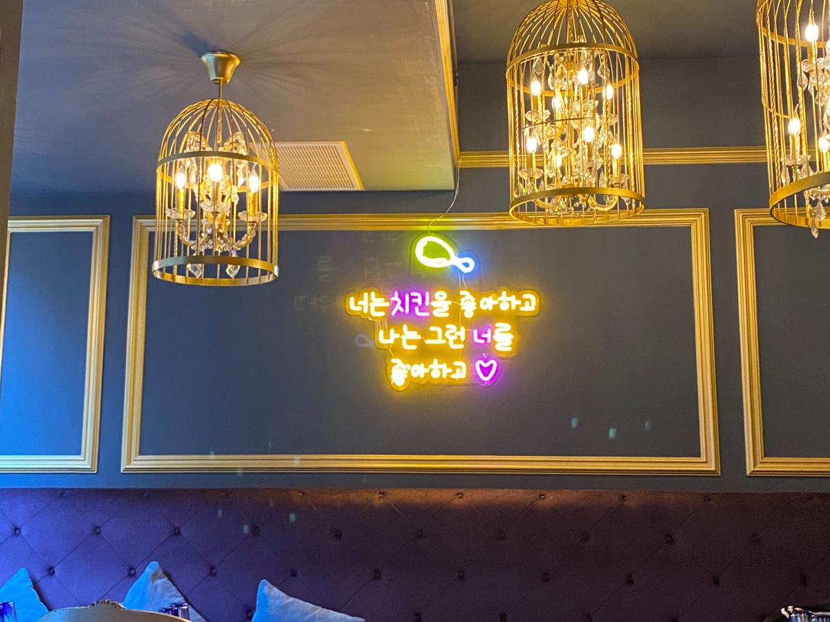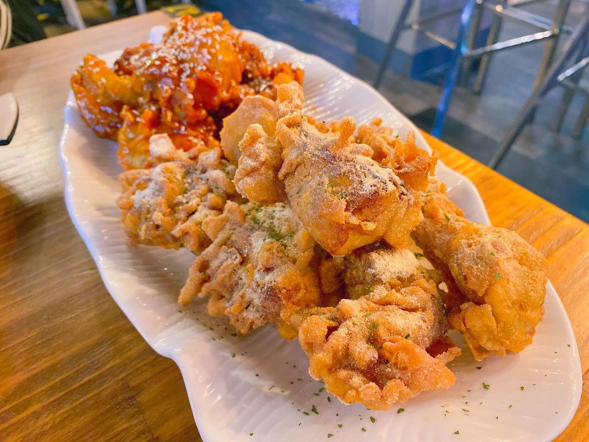 #半半炸雞 $520 #招牌洋釀 就是經典的韓式醬汁,沒有選辣味的,所以偏甜; #起司 我以為是淋起司醬結果是起司粉!炸雞的外皮酥酥脆脆的配上起司粉超像在吃洋芋片!雞肉不柴,蠻嫩的。