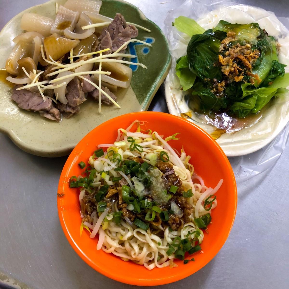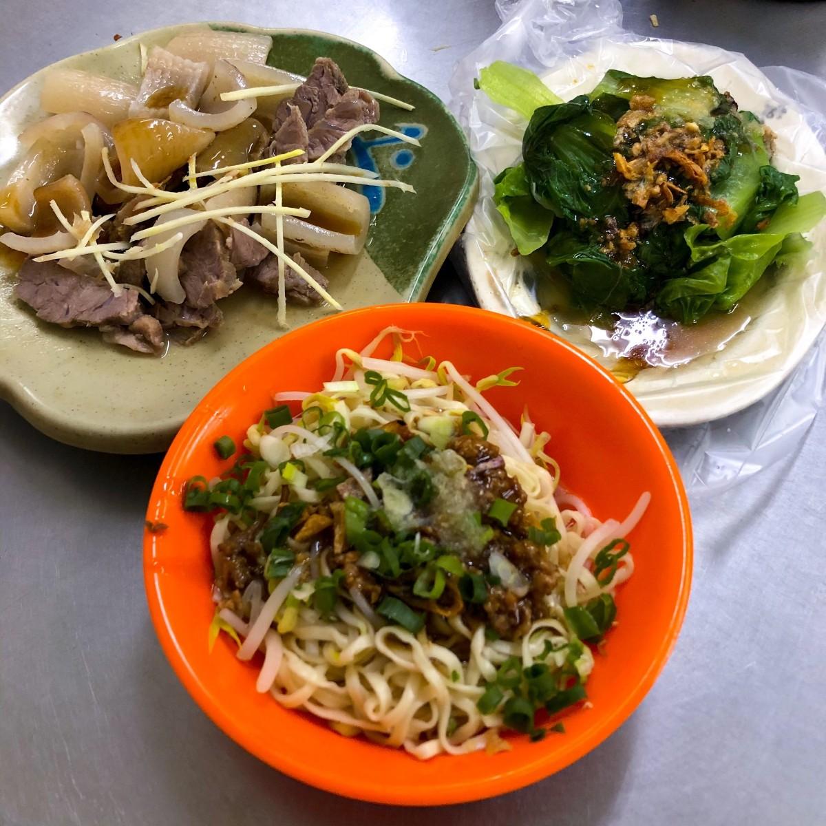 一碗乾意麵、一份燙青菜、一份豬皮及一份嘴邊肉,在台北市少說也需要150元吧?