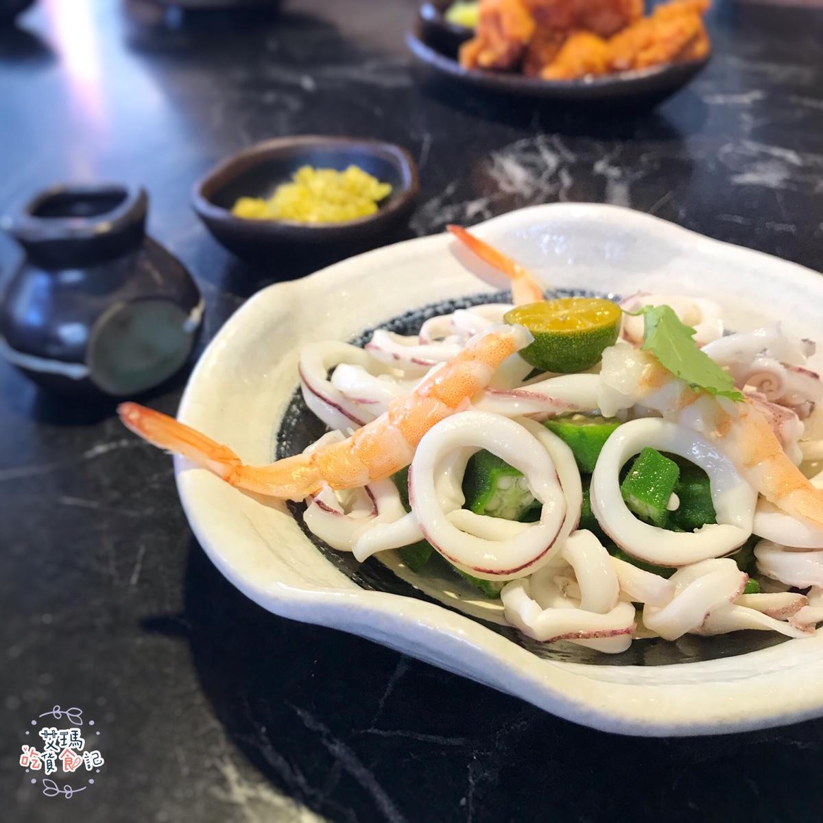 #硬硬的炸雞 皮薄酥脆鮮嫩多汁,雖然敘述很老梗,但很可以點#醬汁小卷 小卷很新鮮很嫩與酸甜的醬汁真的絕配,搭配秋葵一起吃更有不同的風味。