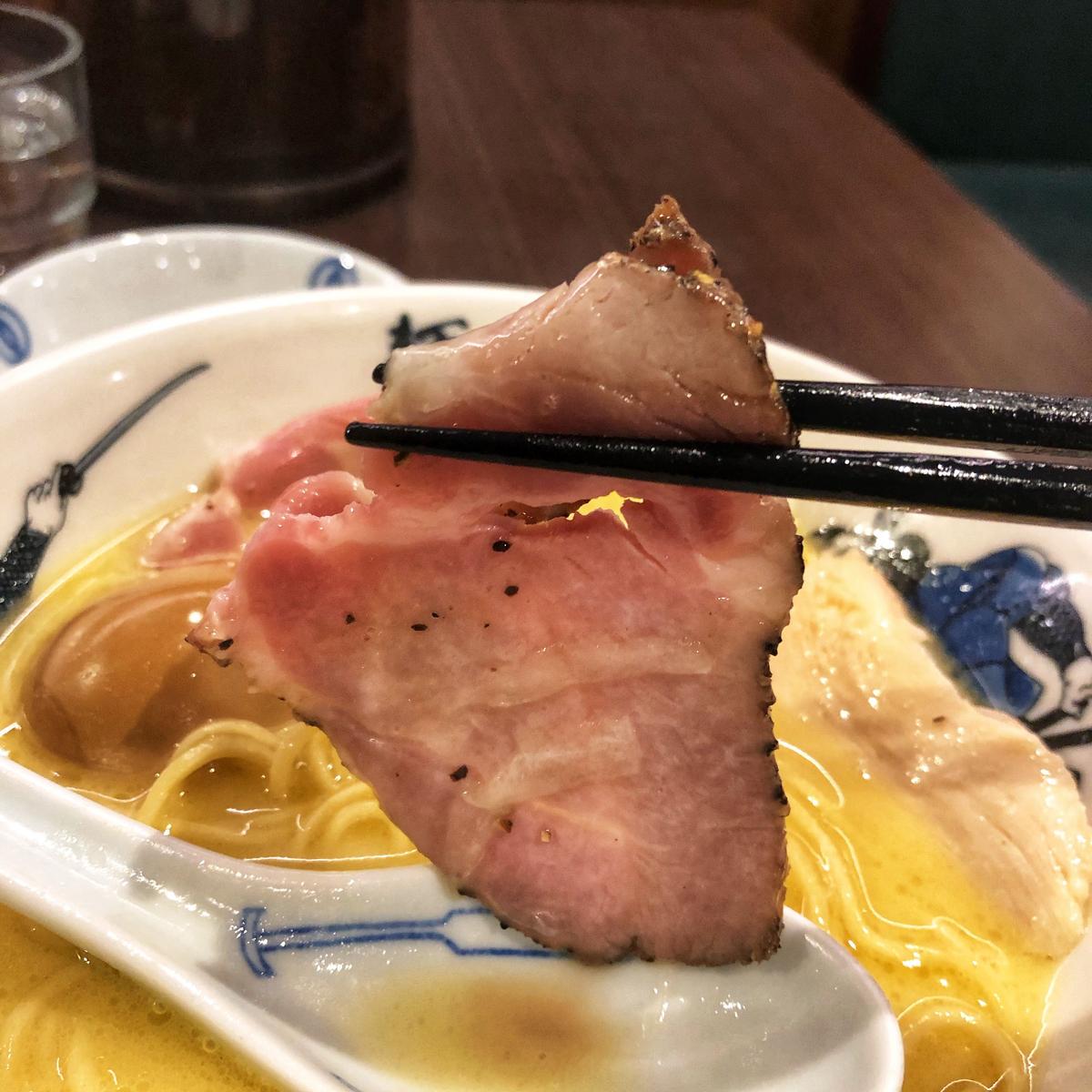 #雞叉燒 白皙嫩皮,舒肥雞胸,吃起來清爽又無負擔。#豬叉燒 肉質呈現完美粉紅色,胡椒粒點綴,柔軟多汁洽到好熟度,是叉燒中的頂級真品。一碗拉麵中有兩種不同叉燒肉,雙重享受,真好。
