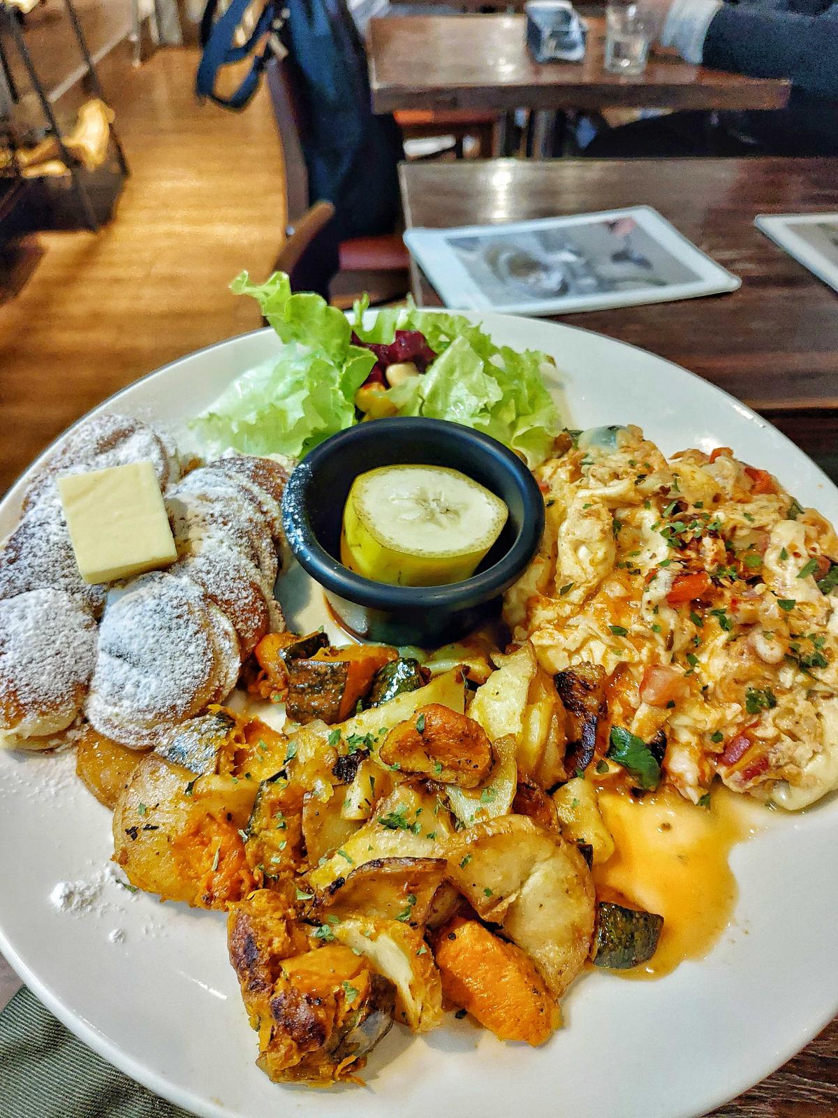 可以選擇農村麵包,法式吐司,烤白吐司及我們選的荷蘭小鬆餅,小鬆餅真的是小鬆餅,我都一口吃一個😁屬於軟Q的口感,有點像雞蛋糕😋鮮蝦與番茄炒蛋混合在一起,實在美味👍炒南瓜馬鈴薯更是健康綿密好吃🤩