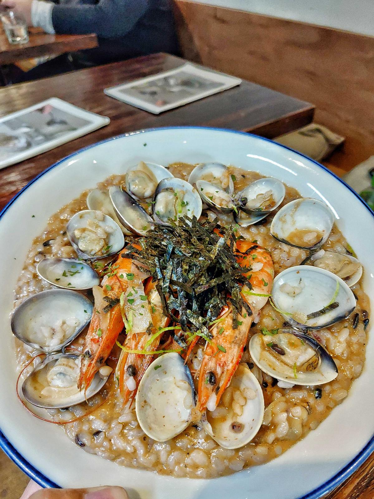 點餐前店員很貼心提醒,他們家的燉飯偏硬,如果要軟點可以跟他們說,我選擇軟點的飯,吃起來滿濃郁的,滿合我胃口的,蝦子跟蛤蜊給的份量也滿大方,還附一杯紅茶,實在滿足👍
