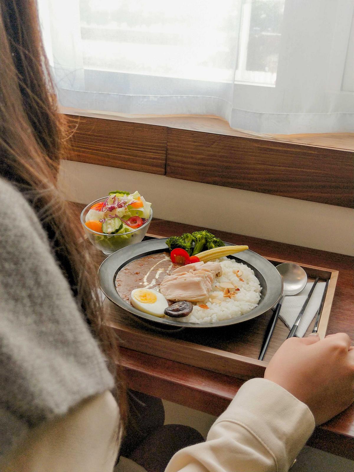 米飯粒粒分明口感Q彈有勁,配料的部分都是非常原型的食物,蘸著咖喱醬吃剛剛好